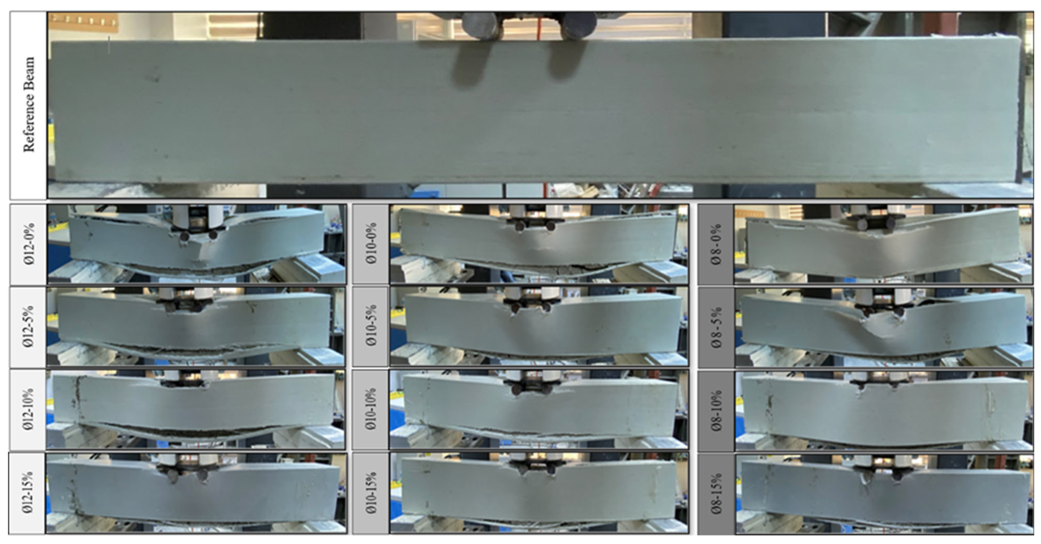 - As a result of the four-point bending tests on the beams, the inclusion of waste rubber aggregates in the concrete mixtures at the rates of 10% and 15% affected the mechanical properties of the concrete and significantly reduced the maximum load-carrying capacity. However, it was determined that there was an improvement in terms of ductility compared to the reference beams.