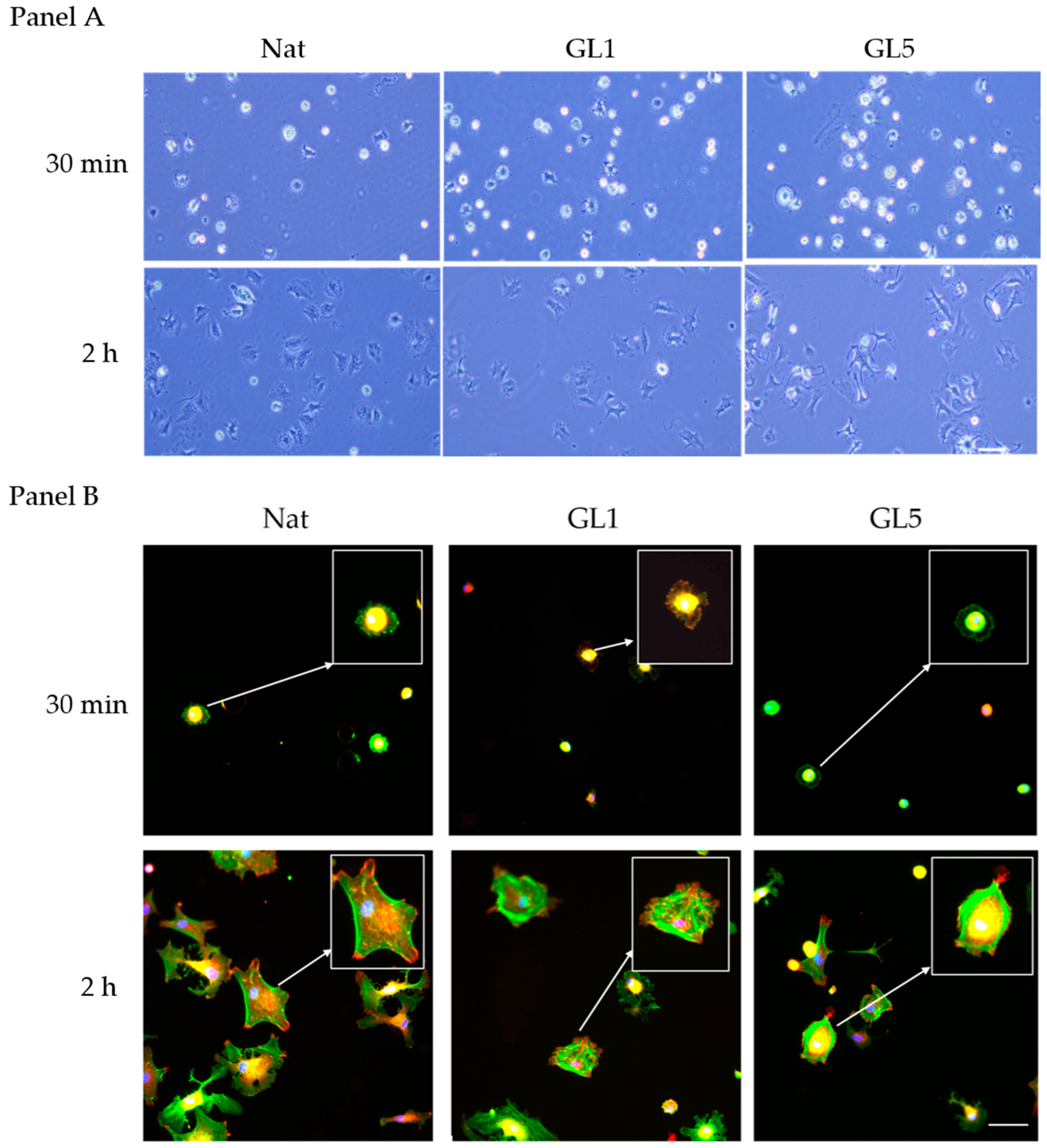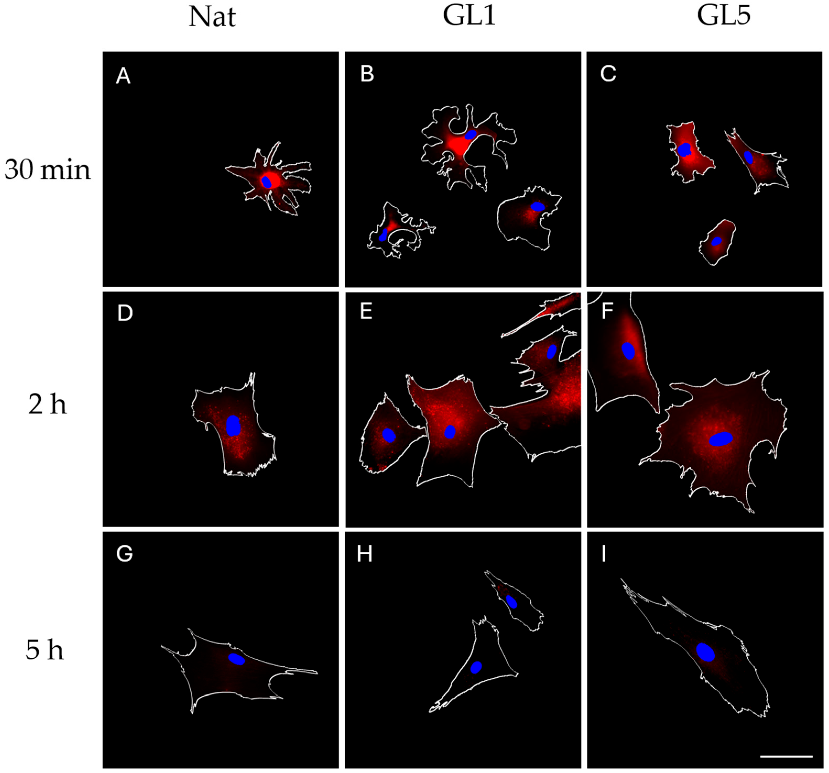 Figure 1, Panel B, GL5 for 2 h), suggesting an altered substratum interaction, whereas those glycated for one day (GL1) promote an intermediate morphological phenotype (
