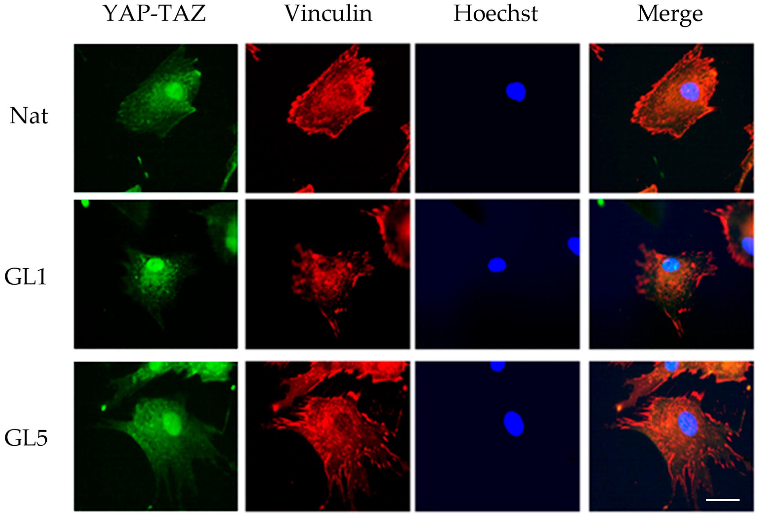 21]. In parallel, emerging evidence underscores the pivotal role of the Hippo signaling pathway in relaying mechanical cues to the nucleus. To concurrently assess FA dynamics and Hippo pathway activation during ADMSC adhesion to glycated collagen substrates, we focused on the immunofluorescent visualization of FAs and the YAP/TAZ signaling axis, the principal intracellular effectors of Hippo pathway.