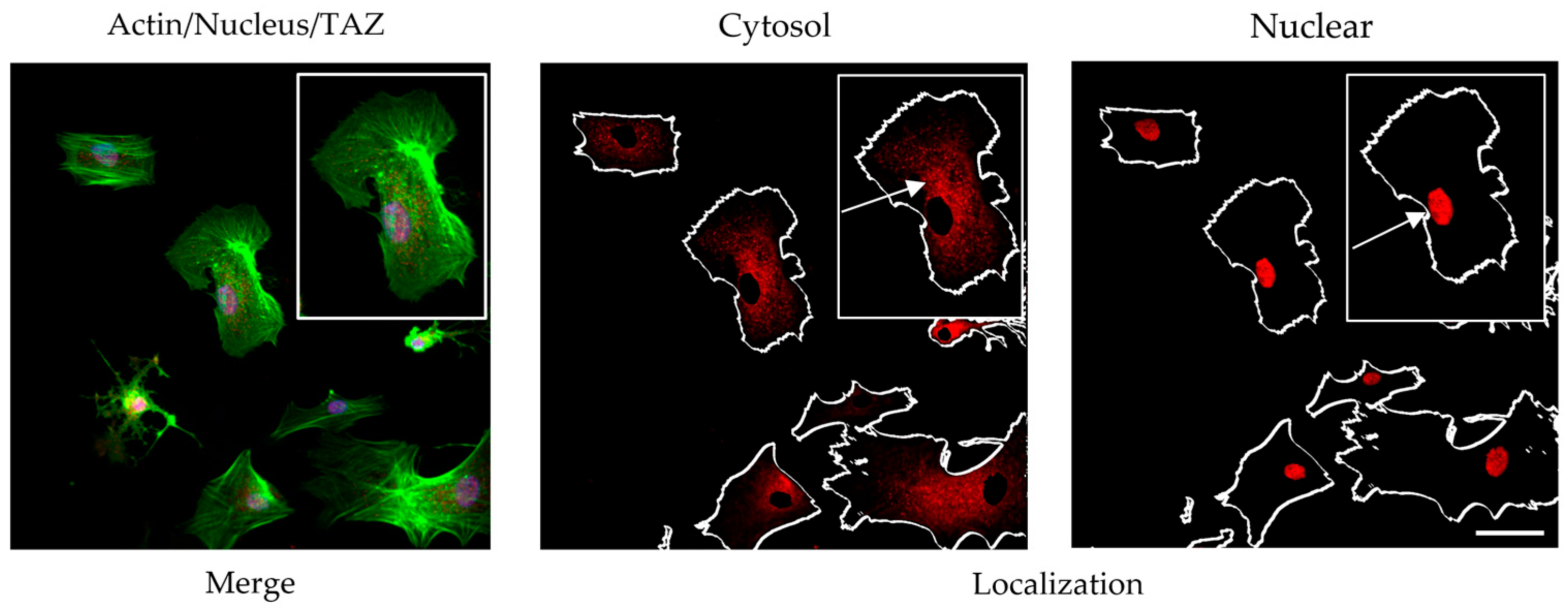 Figure 4). Quantification of TAZ activity was based on the ratio of nuclear to cytoplasmic signal intensity. To ensure accurate spatial resolution, nuclear counterstaining was performed, enabling clear delineation of intra- and extranuclear compartments for precise assessment of TAZ distribution.