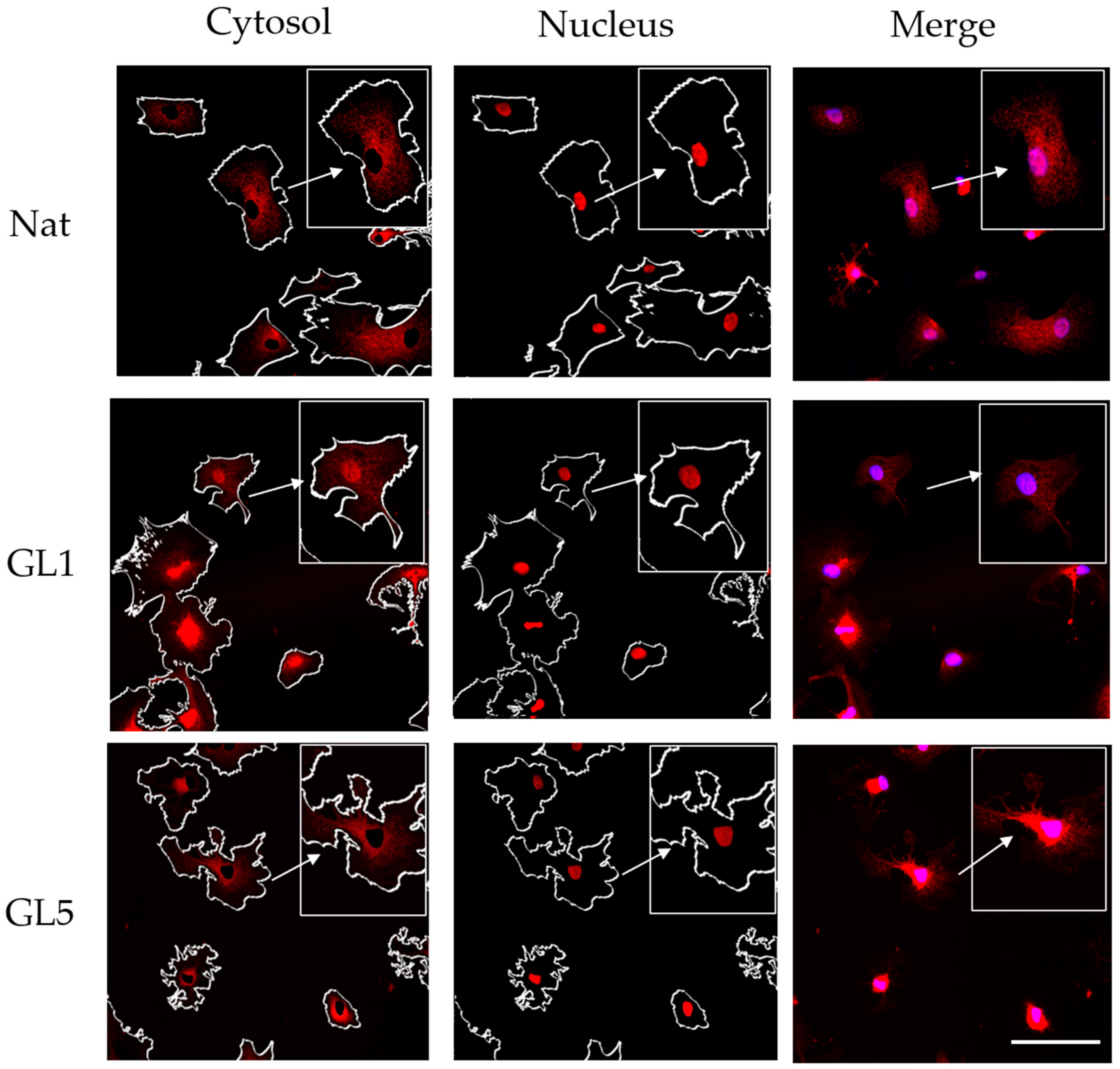 Figure 7 as quantitative data—expressed as nuclear-to-cytosolic fluorescence intensity ratios—covering 30 min, 2 h, and 5 h of incubation. Quantification was performed using ImageJ 1.54g.