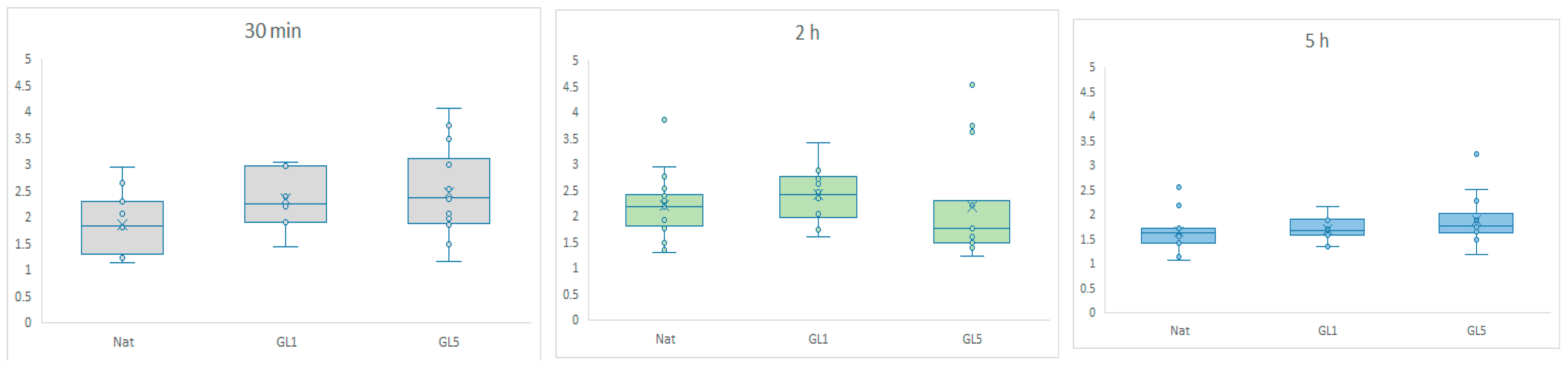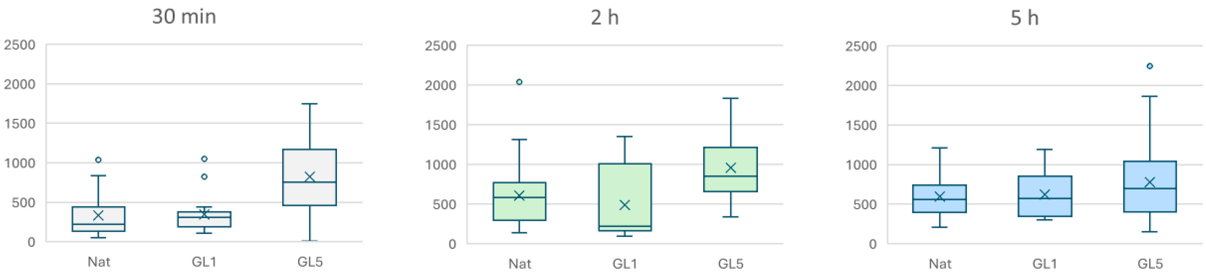 Figure 8. Following incubation, cells were fixed and immunostained using an anti-human collagen type I primary antibody, with visualization achieved via a green-fluorescent goat anti-rabbit secondary antibody. Fluorescence intensity, expressed as Arbitrary Photometric Units (APU) per cell, was quantified using ImageJ 1.54g software. Box-and-whisker plots represent the intensity of endogenous collagen fluorescence in AU (Arbitrary Units), displaying the median, interquartile range (IQR), and full data spread. Comparisons were made across native collagen (control), GL-1 (1-day glycated), and GL-5 (5-day glycated) substrates at three time points: 30 min (gray), 2 h (light green), and 5 h (blue).
