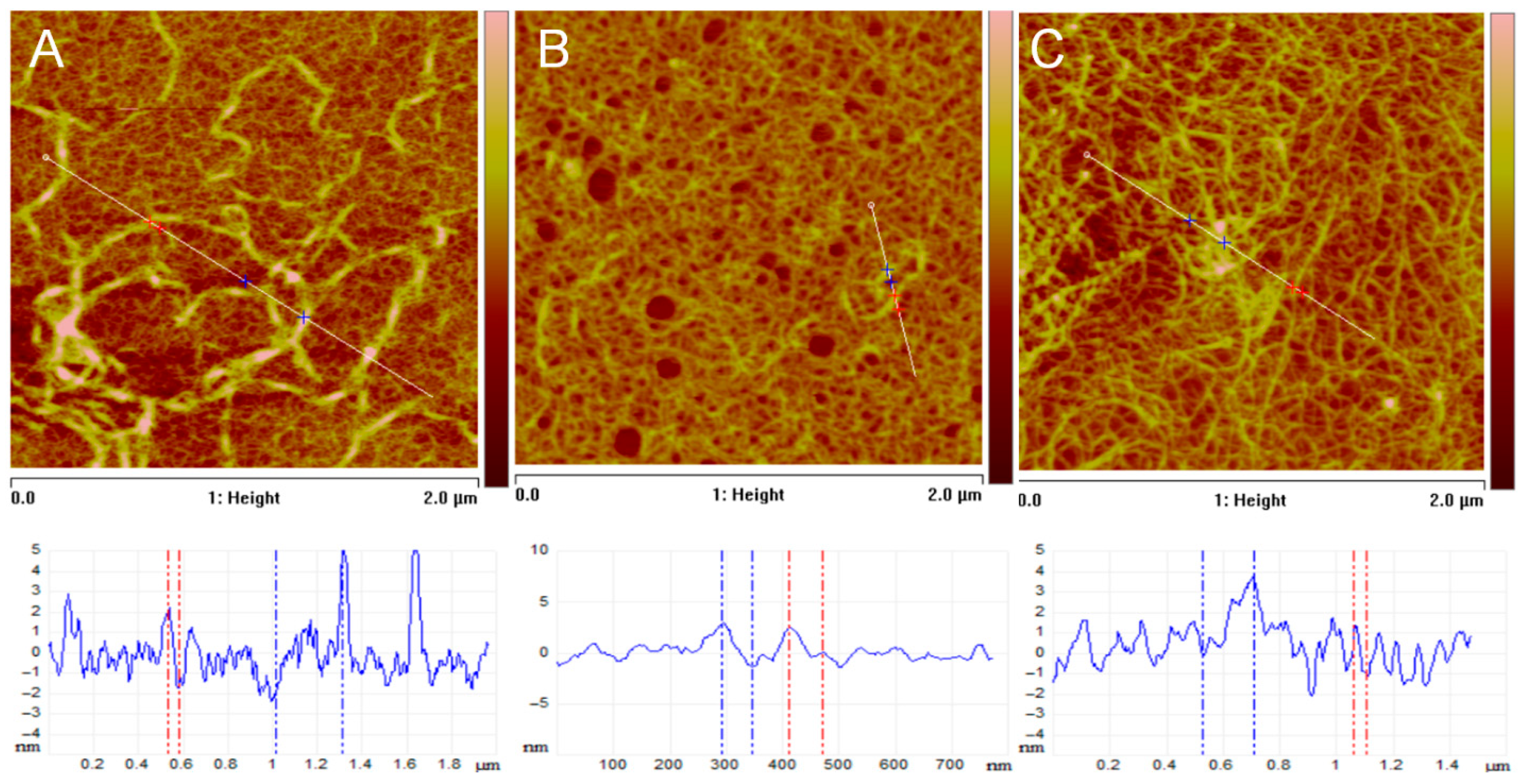 Figure 10A). During the self-assembly process on the mica surface, some regions remain uncovered, appearing as round, substrate-exposed areas. Additionally, there are fewer distinct fibrils, and the surface appears more aggregated and less organized. The height profile exhibits reduced variation, indicating a flatter surface with fewer prominent features. Indeed, the estimated surface roughness is nearly half that of the native collagen sample, with an Rₐ value of 0.6 nm. As seen in the image, the collagen network is sparse and poorly developed. Fibril dimension measurements further confirm that the fibrils are smaller and less defined than those in the native sample, with diameters ranging approximately from 1 to 2 nm.