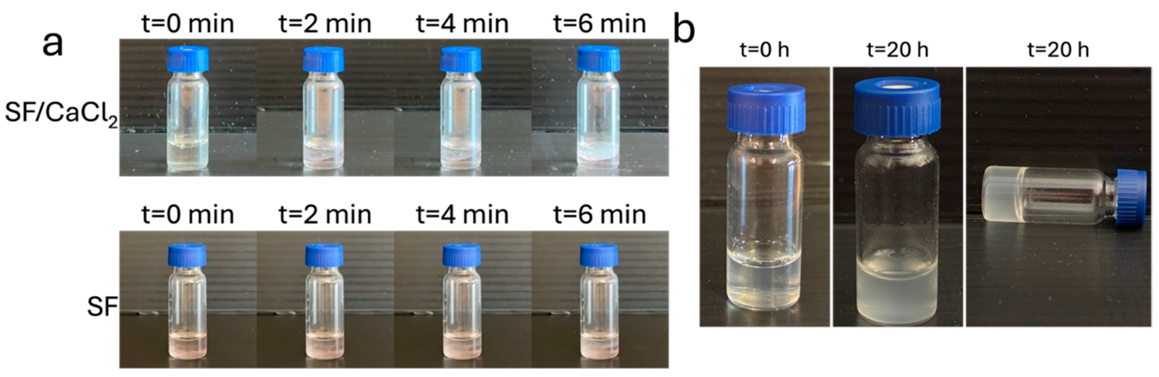 - Roamcharern, N.; Matthew, S.A.L.; Brady, D.J.; Parkinson, J.A.; Rattray, Z.; Seib, F.P. Biomimetic Silk Nanoparticle Manufacture: Calcium Ion-Mediated Assembly. ACS Biomater. Sci. Eng. 2025, 11, 1847–1856. [Google Scholar] [CrossRef]