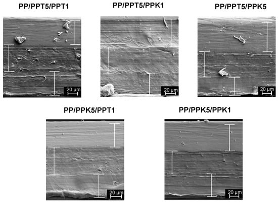 The obtained films, including control monolayer film, present a mean thickness of 150 ± 11 µm. The presence of the trilayers was confirmed by SEM analysis, inspecting the cross-sectional area of films. In this sense, Figure 1 presents the SEM micrographs of three-layer structure of films, indicating a good interlayer adhesion, with no holes or gap between layers. Relevantly, the bottom layer corresponds to PP. Additionally, mineral particles can be identified, mainly in those layers with 5 wt.% fillers. Some of these particles are evident even though they are covered by a thin polymer skin.