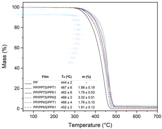 In order to determine total particle concentration and its influence on film thermal stability, Thermo-Gravimetric Analysis, TGA, was carried out. Figure 2 presents the dependence of the relative mass loss with temperature along with the decomposition temperature (Td). Specifically, Td values were determined from the maximum decomposition peak in the derivative curve of thermogravimetric data. The analysis reveals that multilayer films filled with talc (PPT5 layer) present higher thermal stability in comparison with the films filled with kaolin (PPK5 layer) or the neat polymer (control PP monolayer film). The presence of the composite layer (with talc), in the trilayer configuration increases PP decomposition temperature by at least 23 °C, indicating an enhanced thermal resistance. Such behavior has been widely reported [25,49,50], and it can be attributed to their pronounced delamination capability, which enhances the barrier effect by limiting the release of volatile degradation products and consequently delaying the decomposition process [51]. Moreover, total particle concentration in trilayer films was verified from these curves, considering residual mass (m %) values at the end of polymer matrix degradation (Figure 2, inset). The residual masses are in accordance with the nominal total particle concentration theoretically determined in trilayer configuration from layer proportion and its filler concentration.