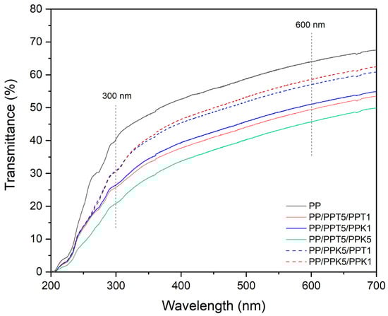 Light barrier properties are critical to reduce photo-oxidation and extending shelf-life of products, so the light transmittance of composite trilayer films at 300 nm in the UV range and 600 nm in the visible range was inspected. As shown in Figure 4, trilayer configuration containing mineral particles as fillers was more effective in enhancing light barrier performance. Regardless of the filler type, light barrier capacity increased with higher filler concentrations. Particularly, films containing a PPT5 layer further reduced light transmittance. The PP/PPT5/PPK5 formulation exhibited significant enhancement, reducing light transmittance by 31.2% at 600 nm (visible light) and a strong reduction by almost 50% at 300 nm (UV) with respect to control monolayer film. In this sense, mineral particles with laminar morphology, such as talc and kaolinite, can scatter and/or absorb light, preserving film translucency [26,27,28,29]. These fillers could also act as passive light barriers and modify polymer crystallinity during material processing, especially in semicrystalline polymers. The presence of crystals and mineral particles contributes to light scattering, creating a dual barrier effect. Such a synergistic mechanism and possible contribution of trilayer configuration significantly reduce light transmittance, enhancing light barrier properties of multilayer films [26].