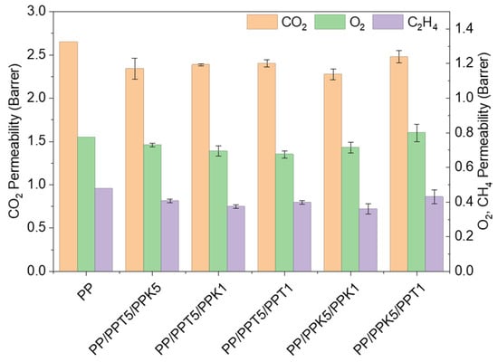 where D is the diffusivity and S is the solubility of the penetrant gas. The equation highlights how both kinetic and thermodynamic factors contribute to gas transport through the material. As shown in Figure 5, carbon dioxide (CO2) exhibited the highest permeability, followed by oxygen (O2) and ethylene (C2H4). Compared to the control film, PP-based trilayer films showed small but systematic reductions in permeability from 5% to 25%, where the largest variations were recorded for CO2 and C2H4, while O2 permeability remained nearly unchanged.