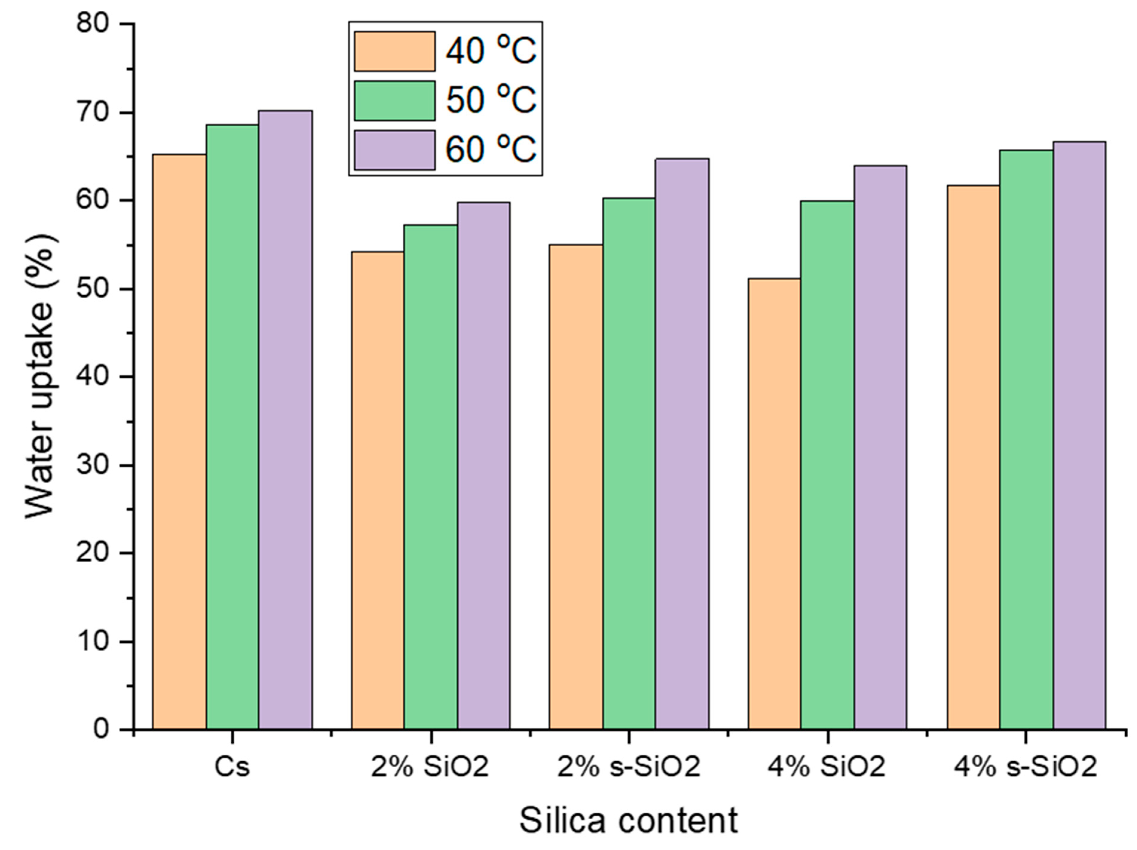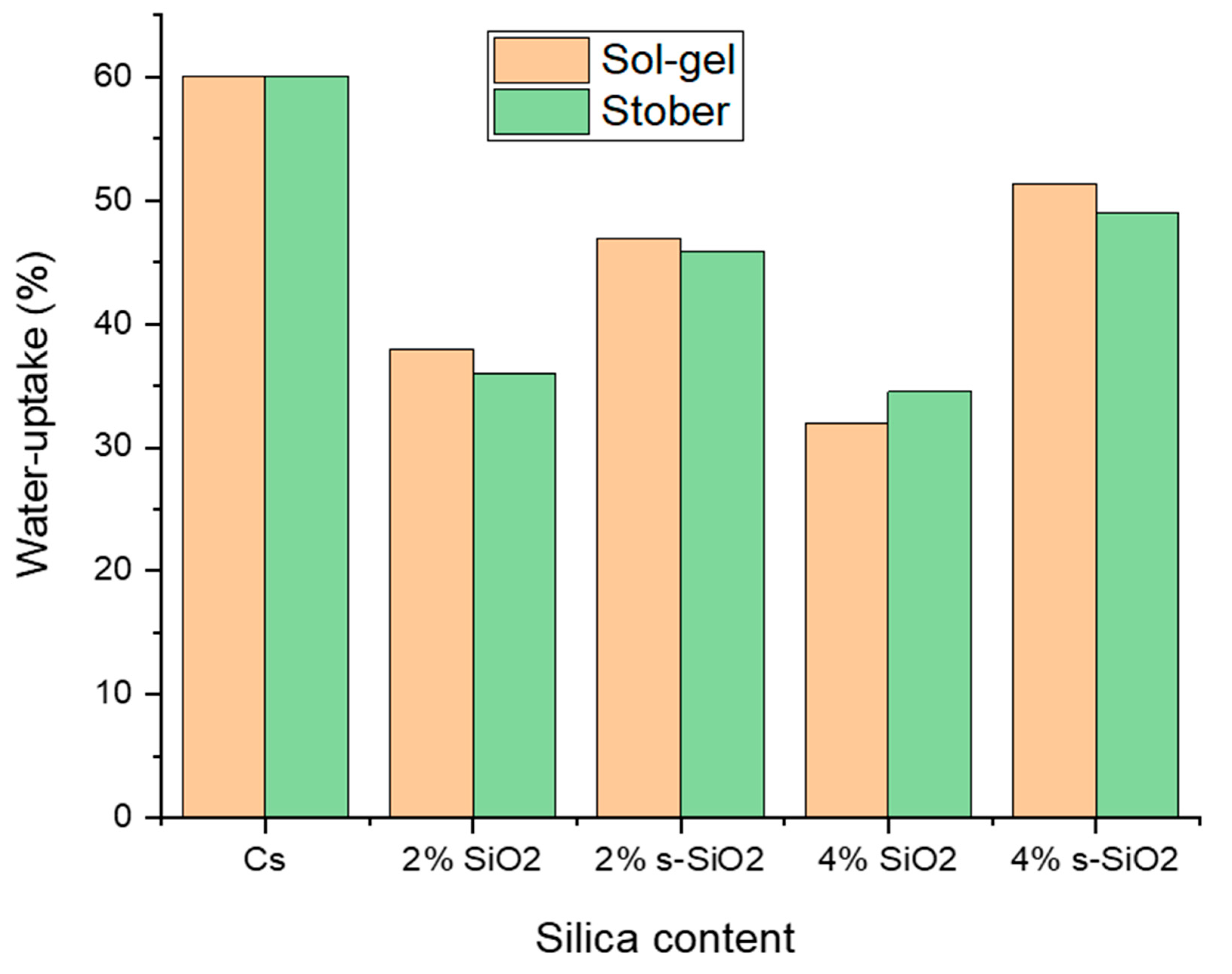 3.4.1. Effect of Silica Content on Water Uptake