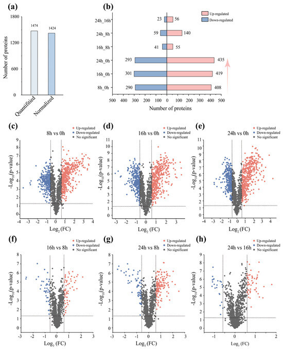 To systematically evaluate the physiological response of D. dadantii strain DCE-01 during the degumming process, we conducted quantitative analysis of the protein expression profiles at different treatment time points (8 h, 16 h, 24 h) using TMT proteomics technology. A total of 1474 proteins were identified (1a). In this study, we compared different time points with the initial state (0 h) to reveal the protein expression dynamics of the bacteria during degumming, and it was found that the number of differentially expressed proteins (DEPs) at 8 h, 16 h, and 24 h remained at a relatively high efficient level (698, 720, and 728, respectively), as shown in Figure 2b. This indicates that the protein profile of D. dadantii strain DCE-01 is highly active throughout the degumming process to adapt and utilize the environment of linen bast degumming.