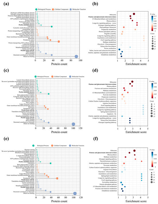 KEGG analysis and GO analysis of the differential proteins in the different degumming time comparison groups: 8 h_0 h, 16 h_0 h, and 24 h_0 h. (a,b) are the KEGG analysis and GO analysis of the differential proteins in the 8 h_0 h comparison group; (c,d) are the KEGG analysis and GO analysis of the differential proteins in the 16 h_0 h comparison group; (e,f) are the KEGG analysis and GO analysis of the differential proteins in the 24 h_0 h comparison group. The pathways highlighted in bold are those closely associated with the degumming process, including “pectin catabolic process”, “pectate lyase activity”, and “pentose and glucuronate interconversions”. They represent the core biological changes across the different degumming time points.