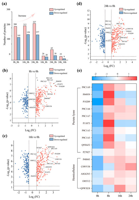 Among the 1424 proteins that have been quantified, up to 792 were identified as enzymes, indicating that the D. dadantii strain DCE-01 secreted a large amount of enzyme substances during the degumming process. Figure 4a shows the statistical count of differentially expressed protein enzymes at different degumming time points. Compared with 0 h degumming, significant protein enzyme differential expression was detected in the fermentation solutions at 8 h, 16 h, and 24 h, and the number of expressed proteins significantly increased, suggesting that the D. dadantii strain DCE-01 continuously adjusted its protein expression profile to adapt to the degumming environment and promote the degradation of the gum. However, the comparison in the subsequent degumming process showed that the number of differentially expressed protein quantities decreased significantly in 16 h vs. 8 h (26/20) and 24 h vs. 16 h (65/28), indicating that the protein expression of the D. dadantii strain DCE-01 tended to stabilize in the later stage of degumming.