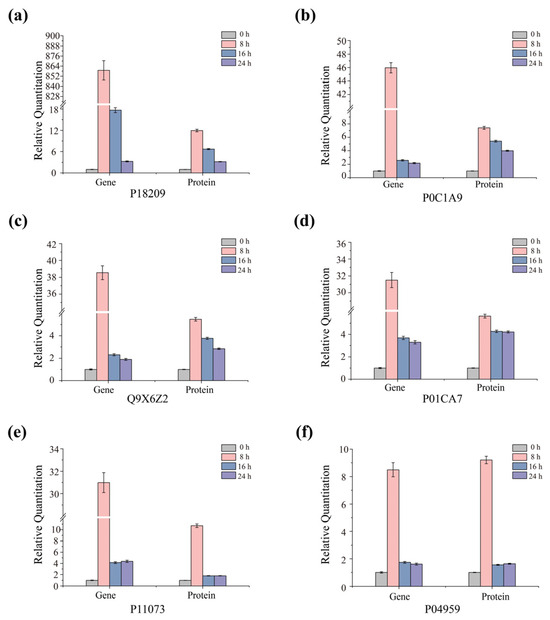 qRT-PCR analysis of key selected transcripts. The differential expression patterns of the six selected enzymes (P18209, P0C1A9, Q9X6Z2, P01CA7, P11073, and P04959) with significant differences in protein expression during the degumming process were verified by quantitative real-time PCR. The mRNA levels at different growth periods were presented relative to the 16S rRNA internal control, with the ratio at 0 h arbitrarily set as 1. Corresponding protein abundance profiles at different growth periods are provided for comparison. The error bars represent the standard deviation derived from six independent mRNA quantitative replicates. (a) P18209; (b) P0C1A9; (c) Q9X6Z2; (d) P01CA7; (e) P11073; (f) P04959.