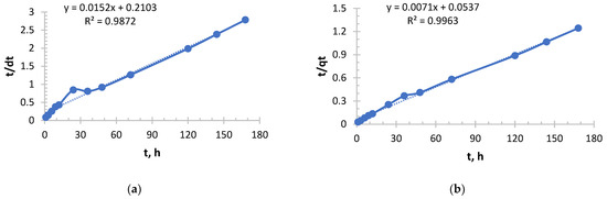 From Figure 8 and Table 6, it can be seen that an extremely sharp increase in the initial sorption rate is observed with increasing concentration. With an increase in concentration from 0.156 to 1.980 g/L, the rate increased 40-fold. This indicates a very strong dependence of the rate of the process on the concentration, that is, a high “order” of reaction for the substance in solution. The driving force of the process (concentration difference) is a key factor.