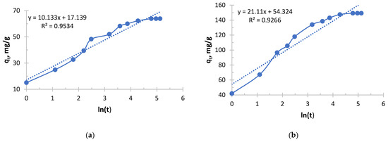 It follows from Figure 11 and Figure 12 and Table 9 and Table 10 that copper sorption with Ionite 2 was characterized by a strong dependence of kinetic parameters on the initial concentration. The key parameter, α, increased exponentially with its increase, reflecting the difference in the initial rate of the process by more than 170 orders of magnitude between the limiting concentrations. In parallel, a steady decrease in the β parameter was observed, which indicates a slower depletion of sorption capacity in concentrated solutions. In this case, the high concentration of copper ions compensates for the increasing difficulty of accessing the remaining active centers of the polymer. As a result, in a solution with a maximum concentration (1.980 g/L), the process was characterized by a high initial speed and stability, whereas in a dilute solution (0.156 g/L), sorption slowed down rapidly after the exhaustion of easily accessible centers. Therefore, high initial concentrations of copper are necessary for the effective manifestation of the kinetic properties of this sorbent.