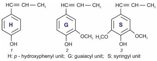 Lignin is a natural branched aromatic polymer that, along with cellulose and hemicelluloses, is a component of vascular plants, including woody plants, herbs, some algae, ferns, and horsetails [1]. Its structure has not yet been precisely determined. However, it is generally accepted that the lignin macromolecule is a combination of three phenylpropane monomers derived from certain precursor compounds known as monolignols, namely, n-coumaryl, coniferyl, and sinapic alcohols (Figure 1) [2].