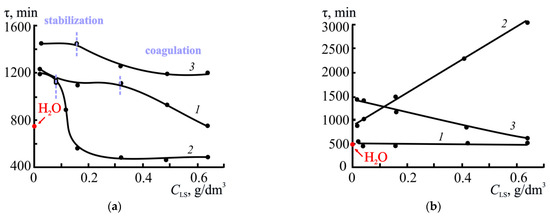 The presented τ = f (CLS) dependences indicated that the sol lifetime in the presence of LS1 and LS3 was higher than in the absence of LS across the entire range of studied concentrations. Two characteristic regions (highlighted by the dashed lines in Figure 4a) of change in the aggregation stability of the sols can also be identified in all dependences. For instance, the maximum system stability for LS1 was achieved in the concentration range of 0.02–0.32 g/dm3, while the sol lifetime was 1200–1210 min. With a further increase in CLS1 up to 0.64 g/dm3, a decrease in stability to 800 min was observed.