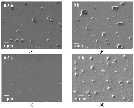 It is also useful to track the change in the morphology of S0 crystallites over time from the moment of their formation. Figure 6 shows SEM images of S0 dispersions formed over time in the absence (Figure 6a,b) and in the presence of LS (Figure 6c,d).