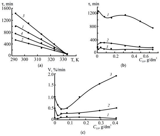 Effect of temperature (a) and LS concentration (b,c) on the lifetime and destruction rate of elemental sulfur suspensions (T = 80%). (a): CLS = 0.16 g/dm3; CS = 0.04 g/dm3; 1-LS1, 2-LS2, 3-LS3, 4-H2O. (b,c): LS1; T, K: 1–293, 2–313, 3–333.