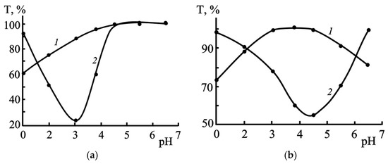 Effect of pH on the stability of elemental sulfur suspensions at temperatures of 293 (a) and 333 K (b). τS: (a)-1440 min; (b)180 min; 1-CLS1 = 0.16 g/dm3; 2-CLS = 0 g/dm3.