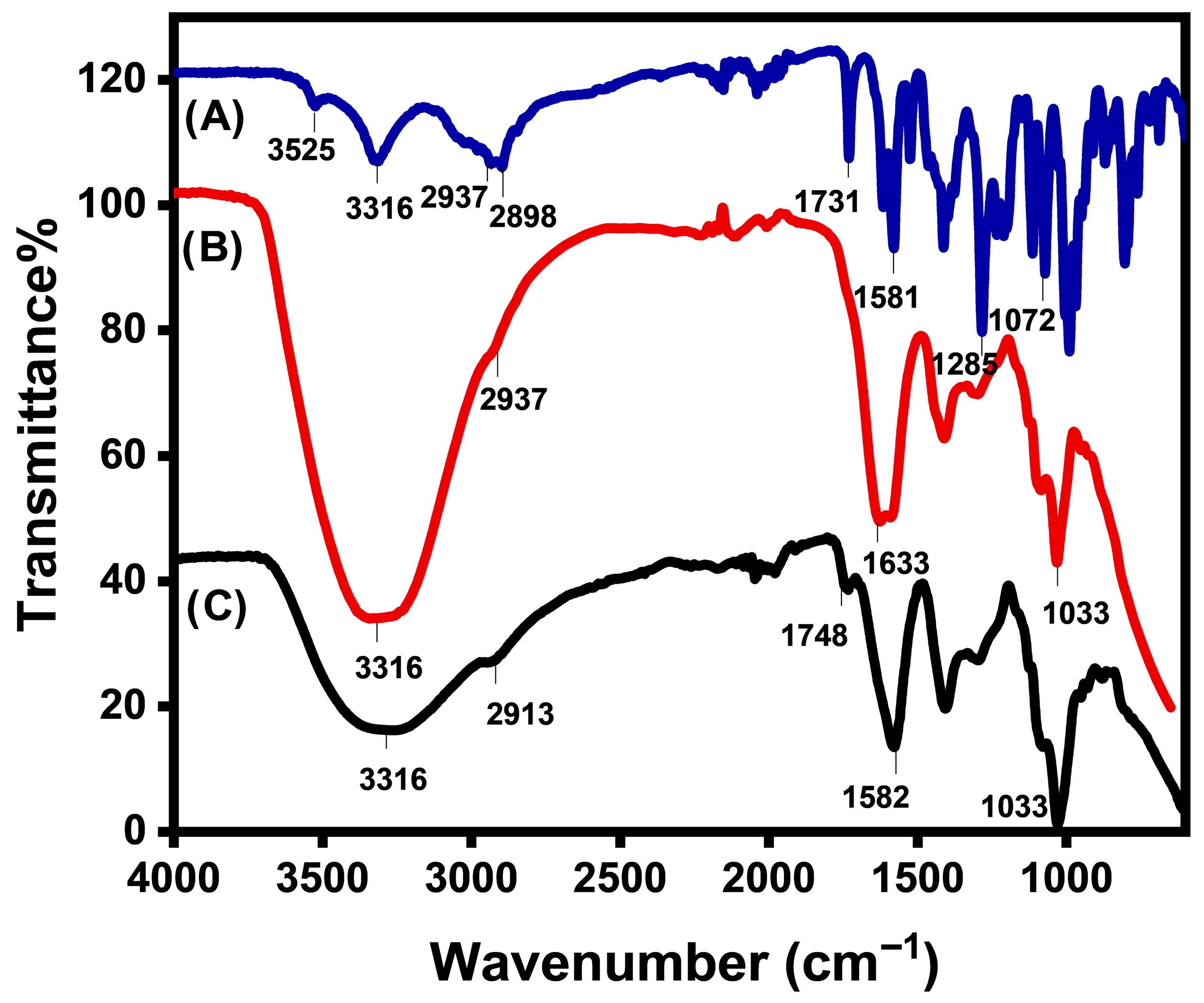 FTIR spectra present the adsorption of doxorubicin hydrochloride onto Fe(III)–Alg. The spectra of doxorubicin hydrochloride are displayed in Figure 5A, showing the characteristic bands of NH2, OH, CH (alkene), CH (alkane), C=O, C=C, C-N, and C-O at 3525, 3316, 2937, 2898, 1731, 1581, 1285, and 1072 cm−1, respectively. The spectra of Fe(III)–Alg, Figure 5B, have bands at 3316, 2937, 1633, and 1033 cm−1 for OH, CH (alkane), C=O, and C-O functional groups, respectively. The spectra in Figure 5C confirms the adsorption of doxorubicin hydrochloride by appearing a band of C=O at 1748 cm−1.