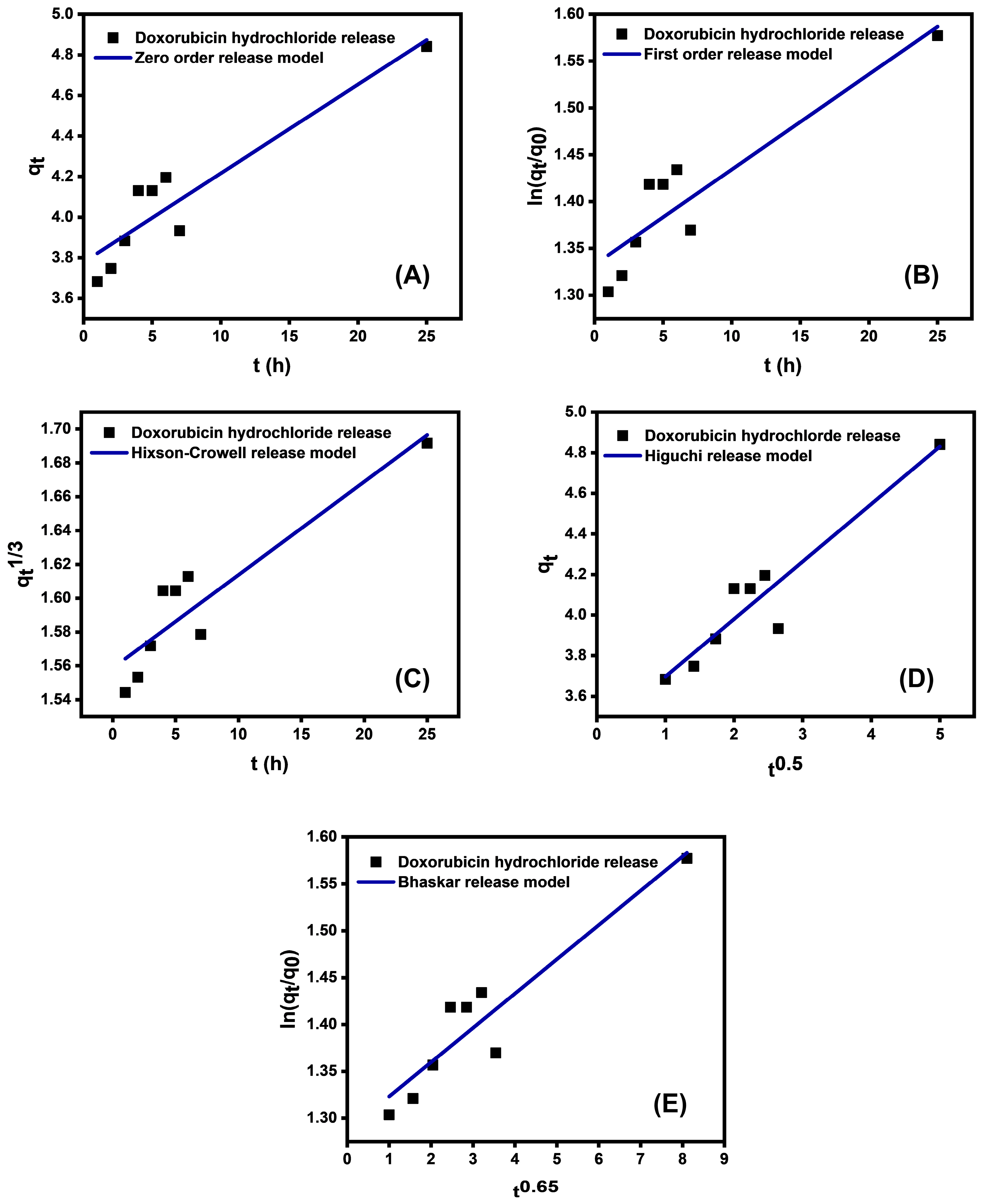 Figure 10. Fitting of doxorubicin-Fe(III)-Alg at pH 1.52 using various models of kinetic: (A) Zero order, (B) First order, (C) Hixson–Crowell, (D) Higuchi, and (E) Bhaskar release models.