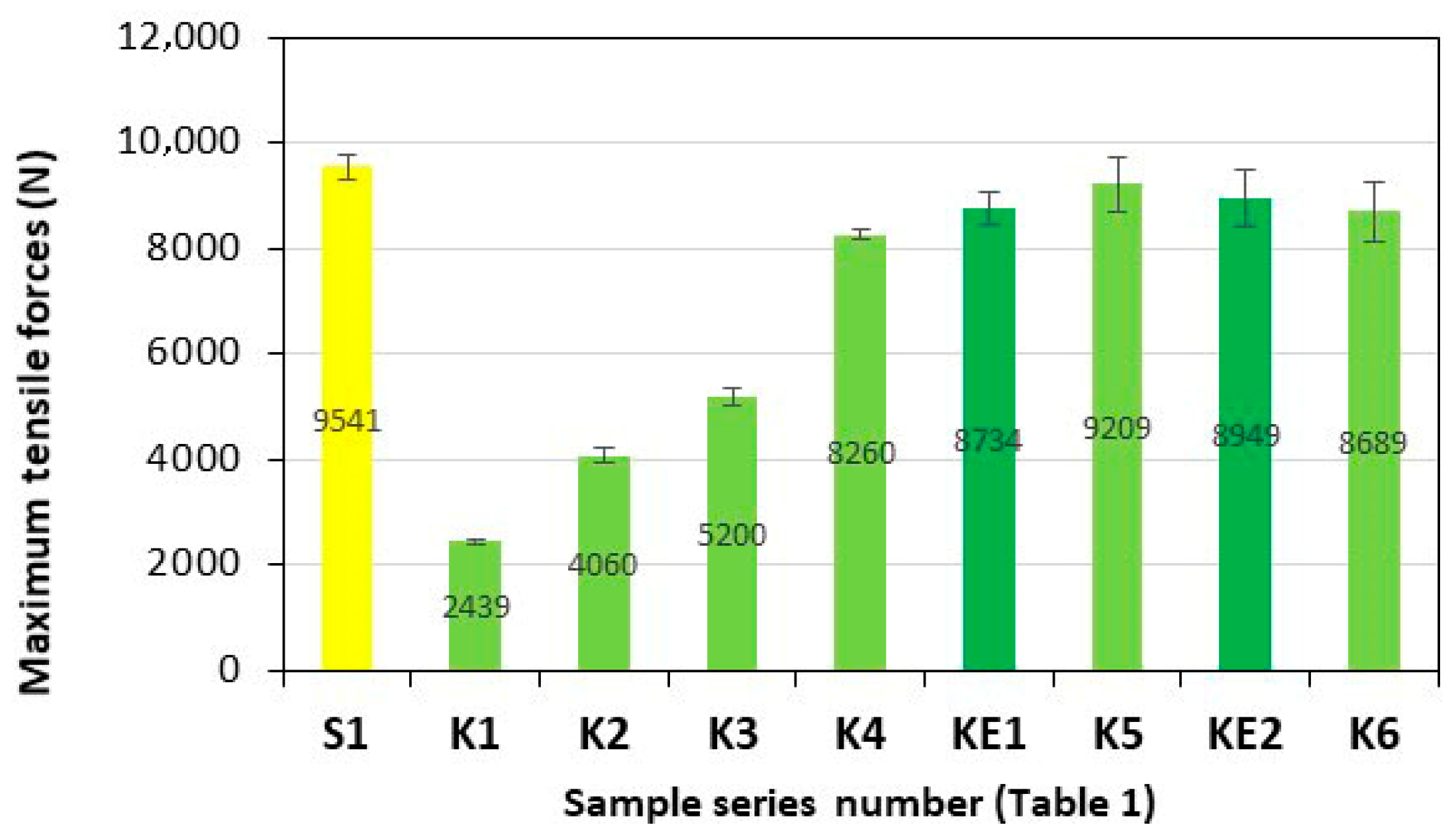 | Number of Tested Reinforcement Layers K1–K6 and Additionally Determined Empirically KE1, KE2 Included in the Analysis Concerning the Determination of the Structural Correlation Coefficient WK | Designation of a Series of Samples |