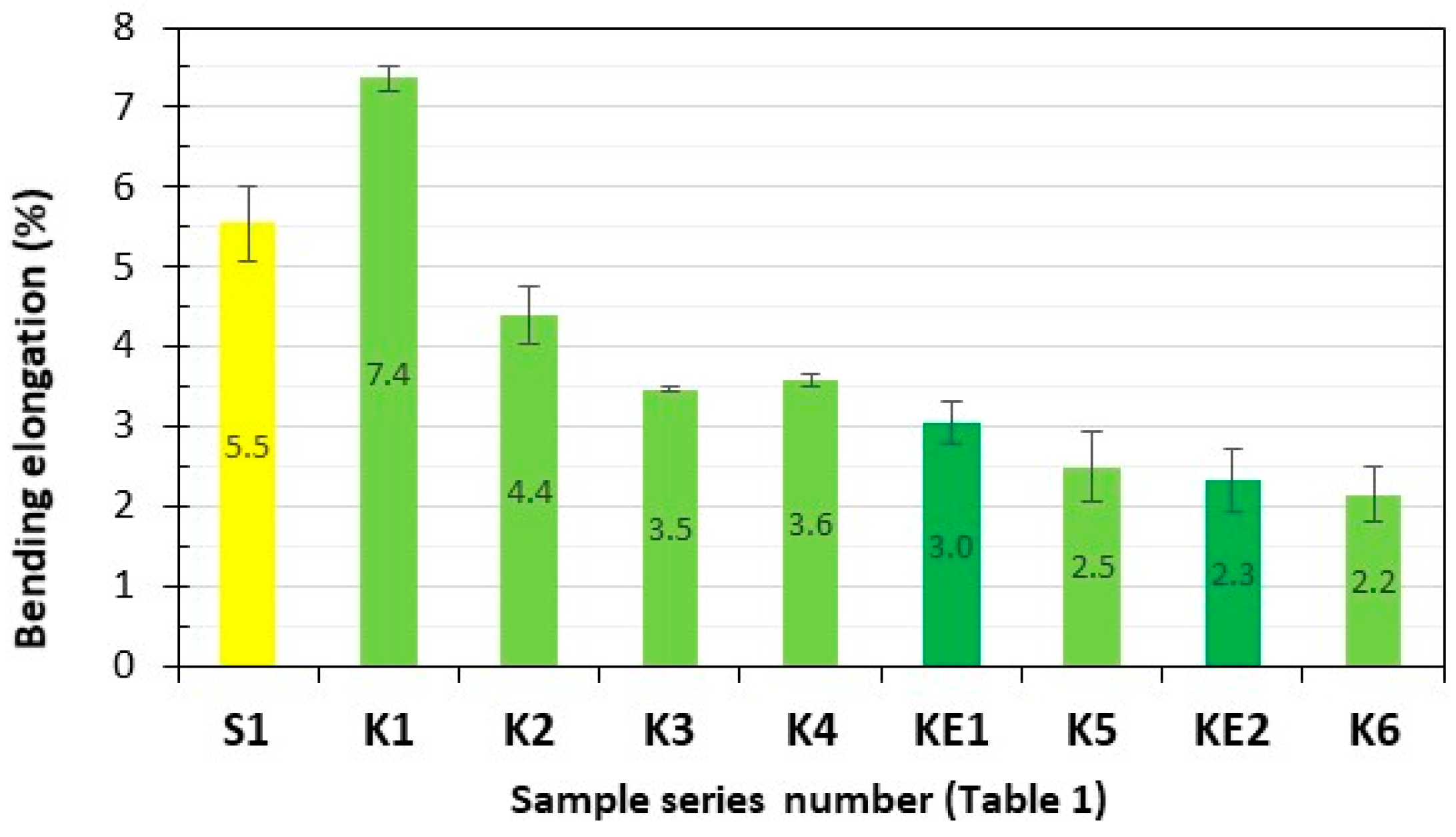 | Elongation under static bending, % | 5.5 ± 0.5 | 2.2 ± 0.3–7.4 ± 0.2 | |