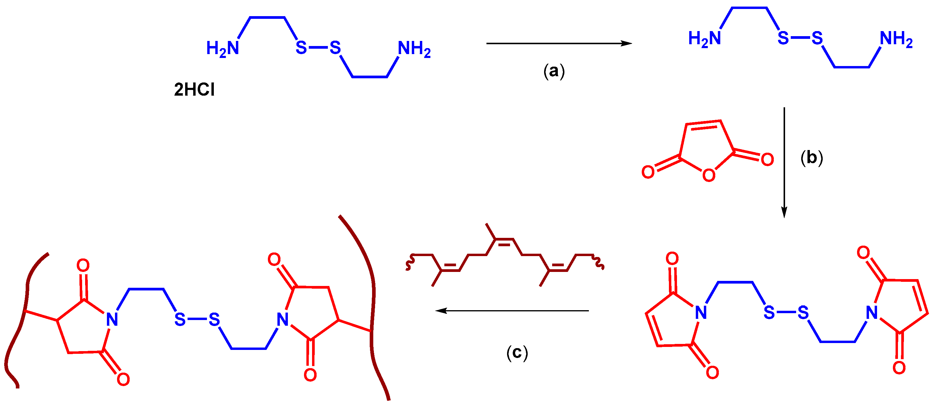 - Kaur, A.; Fefar, M.M.; Griggs, T.; Akutagawa, K.; Chen, B.; Busfield, J.J.C. Recyclable sulfur cured natural rubber with controlled disulfide metathesis. Commun. Mater. 2024, 5, 212. [Google Scholar] [CrossRef]