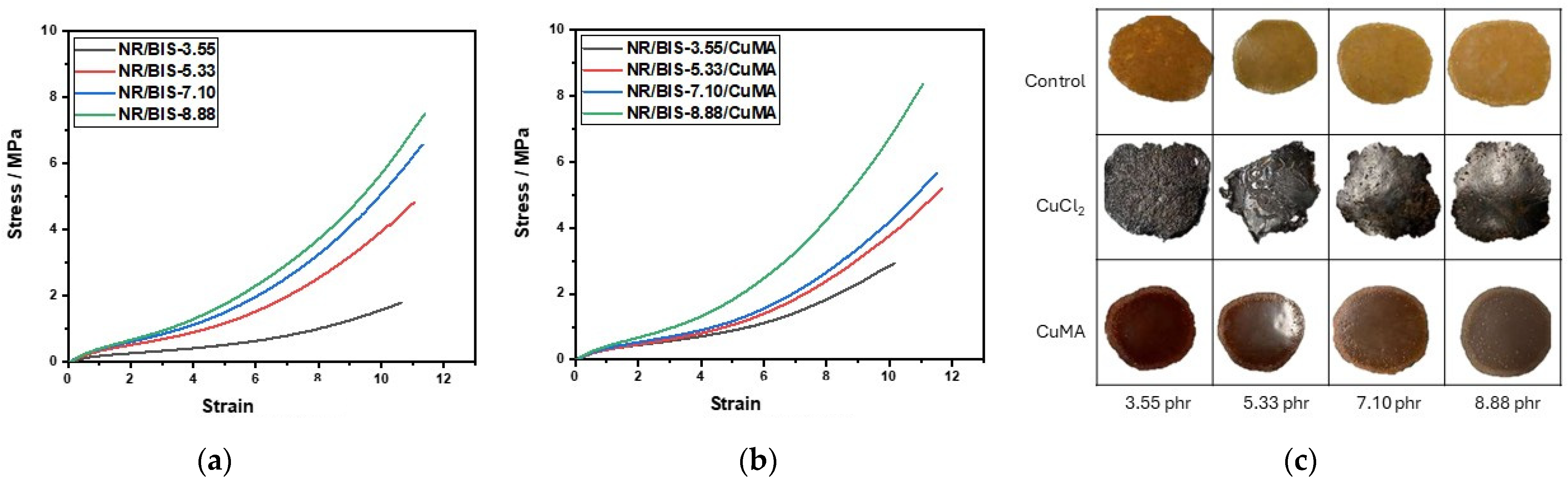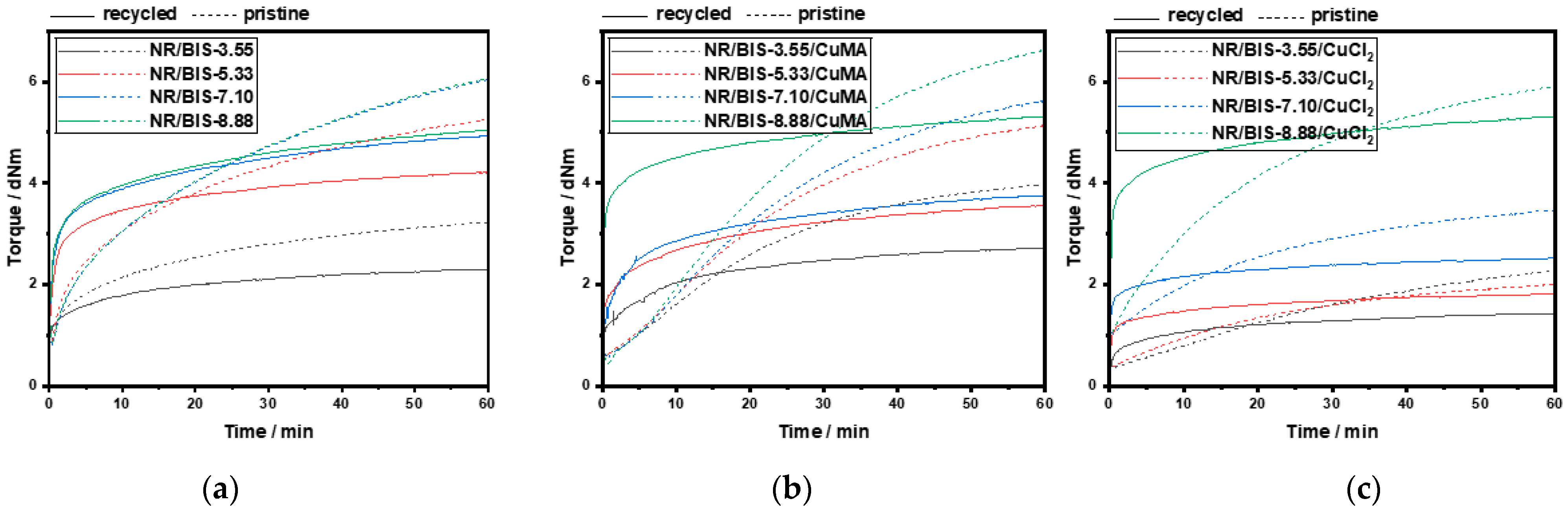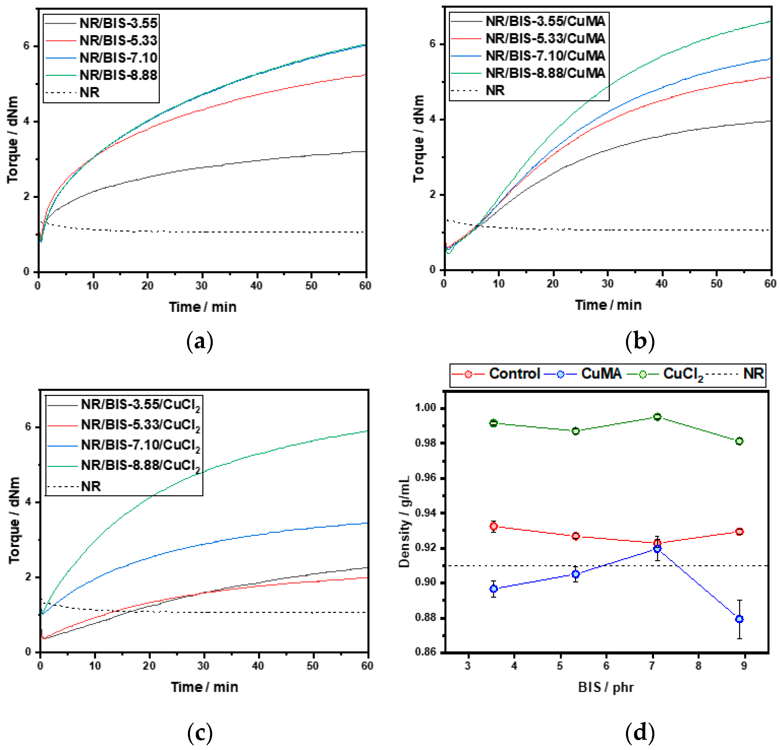- NR/BIS-X/CuCl2: formulations with CuCl2 as inhibitor, with X referring to phr of Bismaleimide introduced; CuCl2 is equimolar to Bismaleimide;