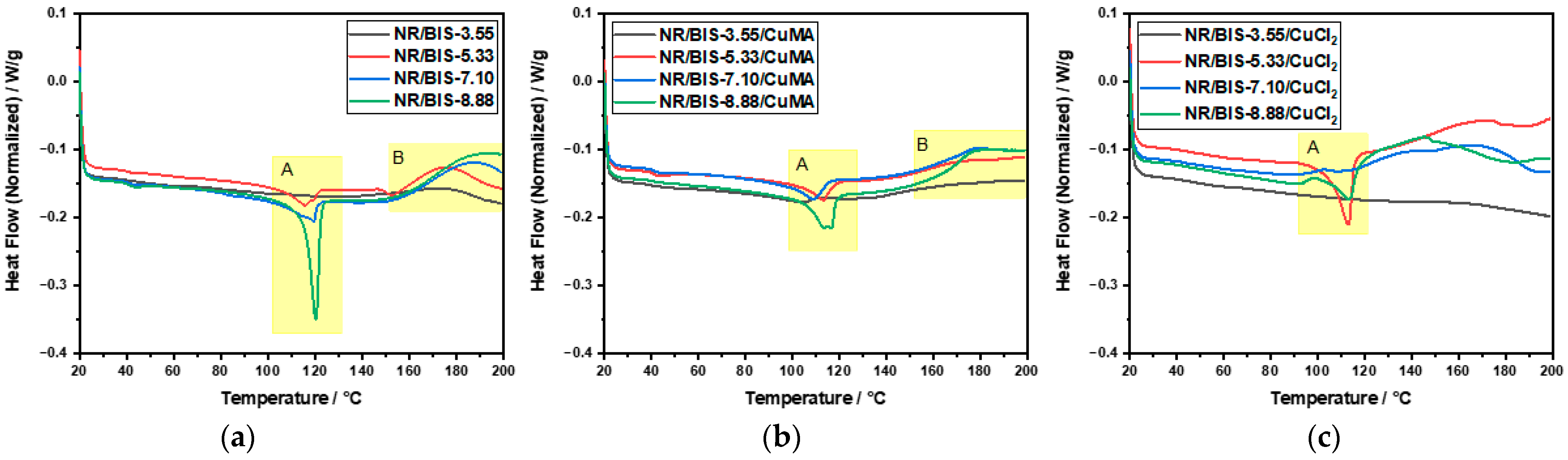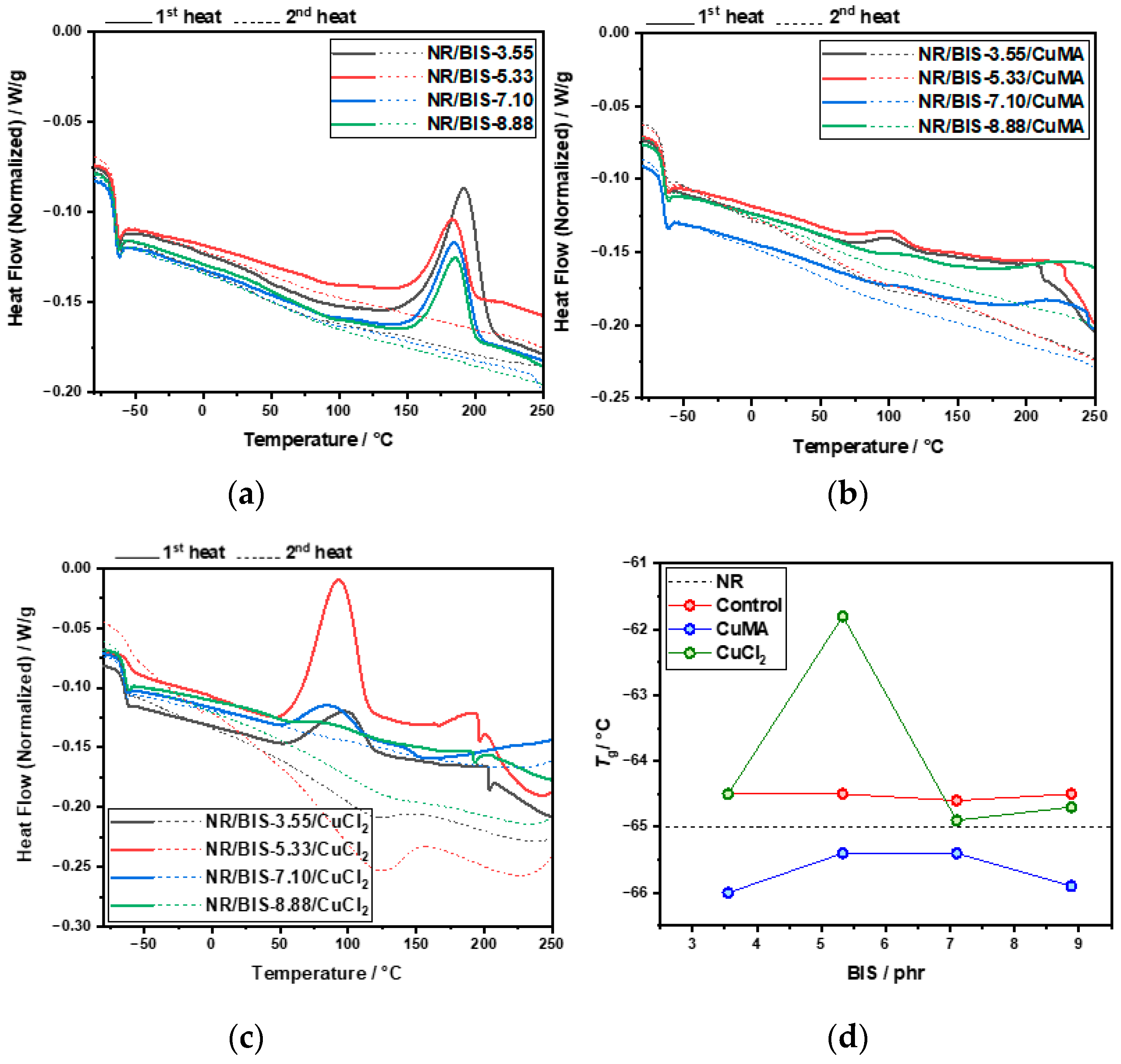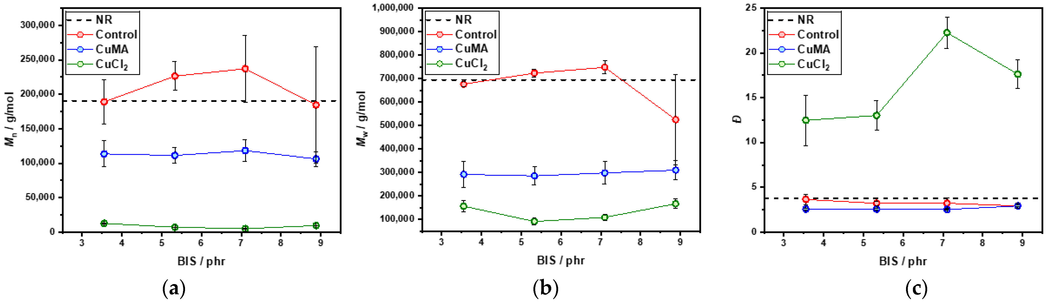 - NR/BIS-X/CuCl2: formulations with CuCl2 as inhibitor, with X referring to phr of Bismaleimide introduced; CuCl2 is equimolar to Bismaleimide;