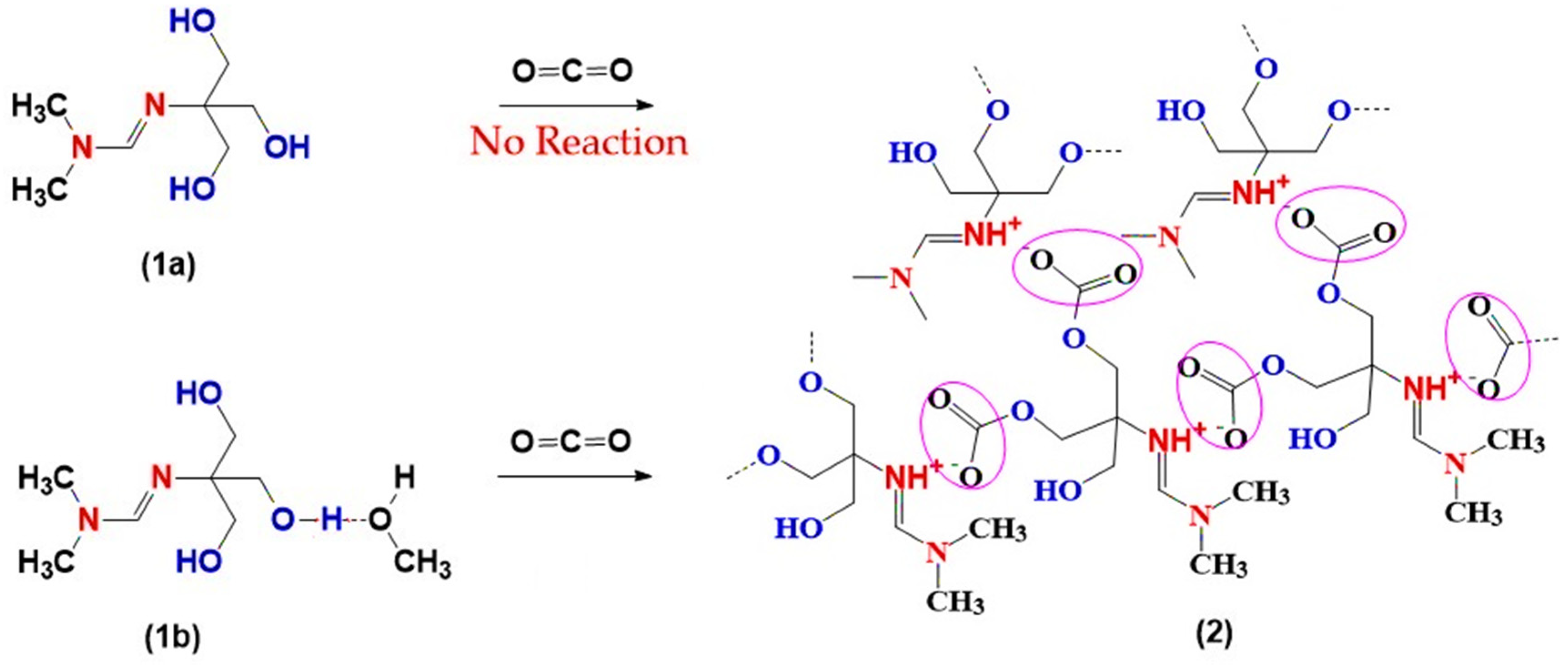 Methanol-Assisted CO2 Fixation by Hydroxyl-Containing Amidine Leading to Polymeric Ionic Liquid and Cross-Linked Network Formation