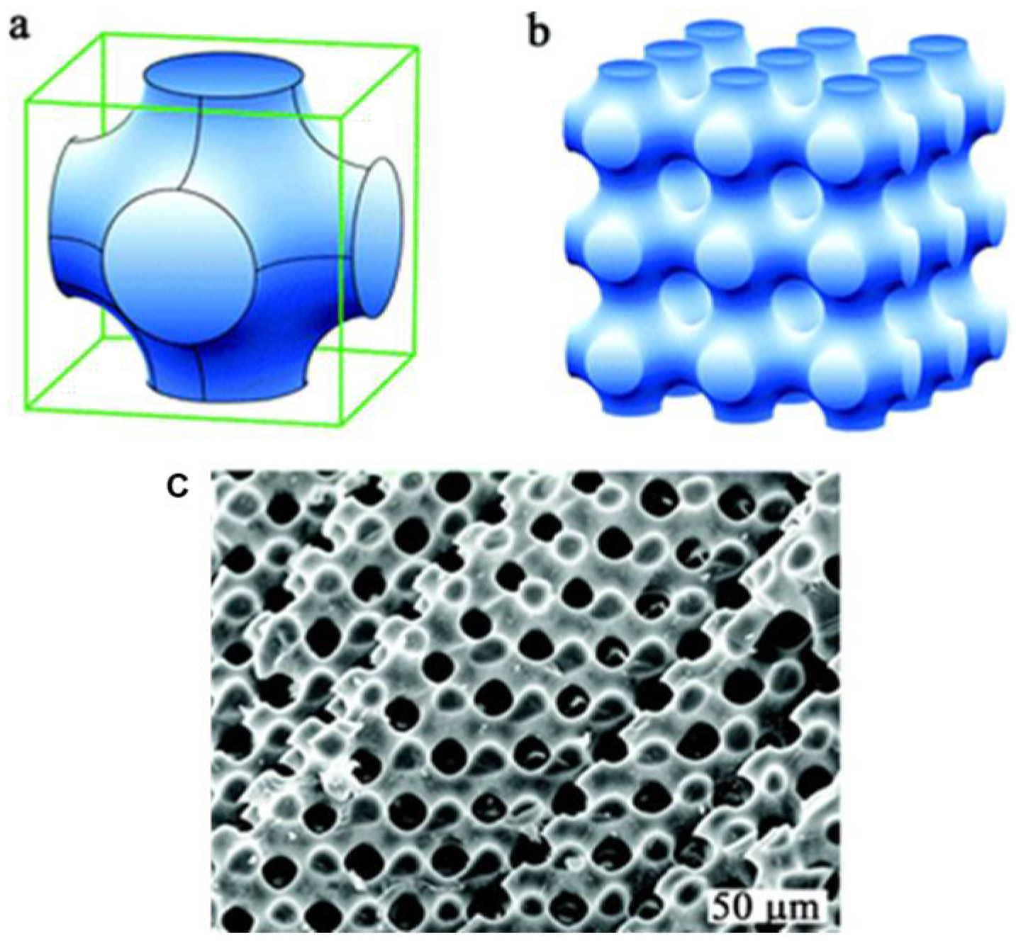 - Bobbert, F.; Lietaert, K.; Eftekhari, A.A.; Pouran, B.; Ahmadi, S.; Weinans, H.; Zadpoor, A. Additively manufactured metallic porous biomaterials based on minimal surfaces: A unique combination of topological, mechanical, and mass transport properties. Acta Biomater. 2017, 53, 572–584. [Google Scholar] [CrossRef]