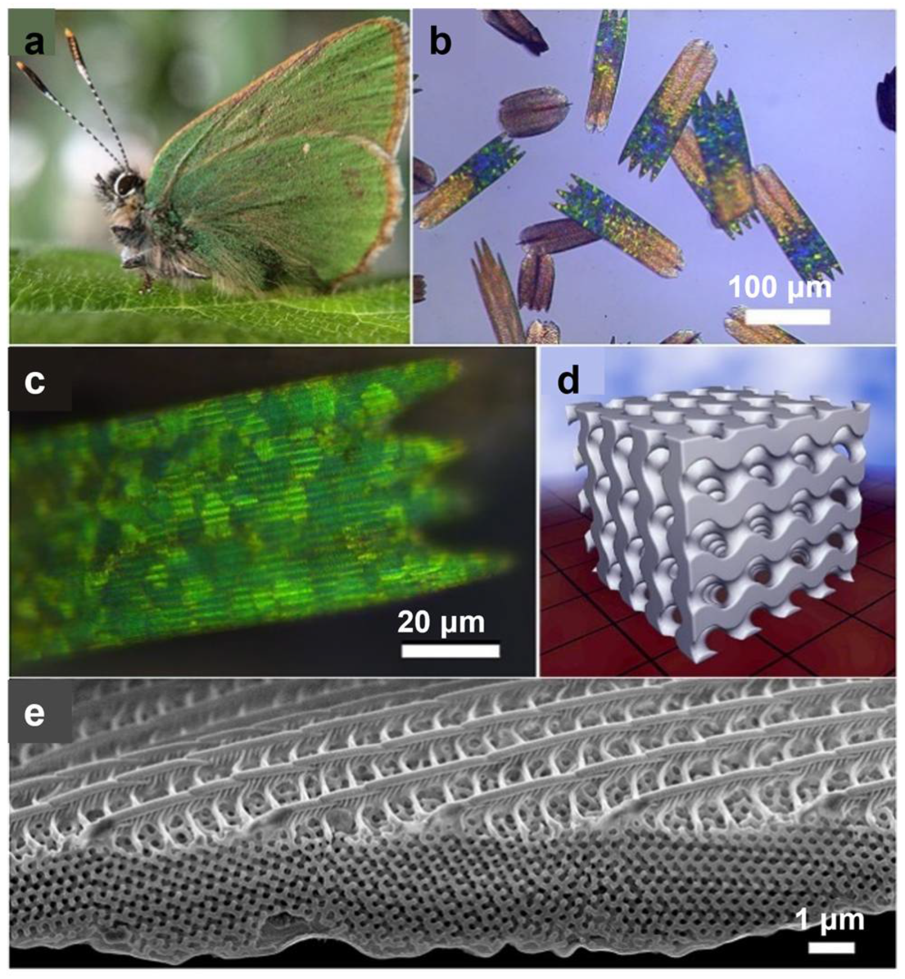 - Corkery, R.W.; Tyrode, E.C. On the colour of wing scales in butterflies: Iridescence and preferred orientation of single gyroid photonic crystals. Interface Focus 2017, 7, 20160154. [Google Scholar] [CrossRef]
