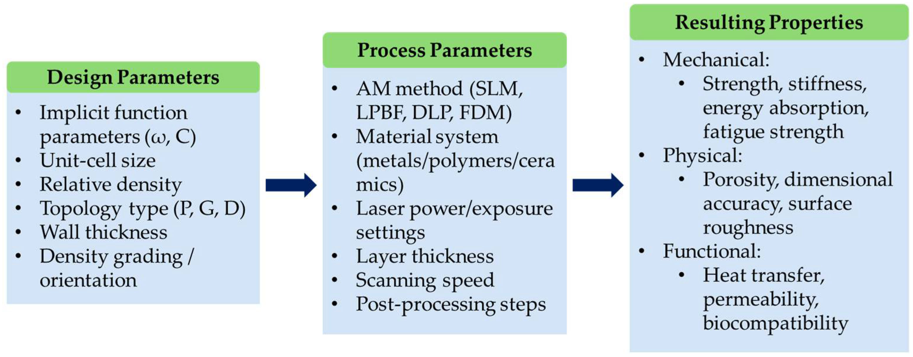 | Energy input (laser power, UV exposure) | Adjust laser/UV energy to achieve sufficient curing or melting without overexposure | Enhance wall resolution and reduce voids or incomplete fusion | Improves curing depth in VPP and stabilizes melt-pool formation in LPBF, leading to better mechanical stability | Decreases the occurrence of process-induced defects, resulting in more predictable outputs | [198,199,201] |