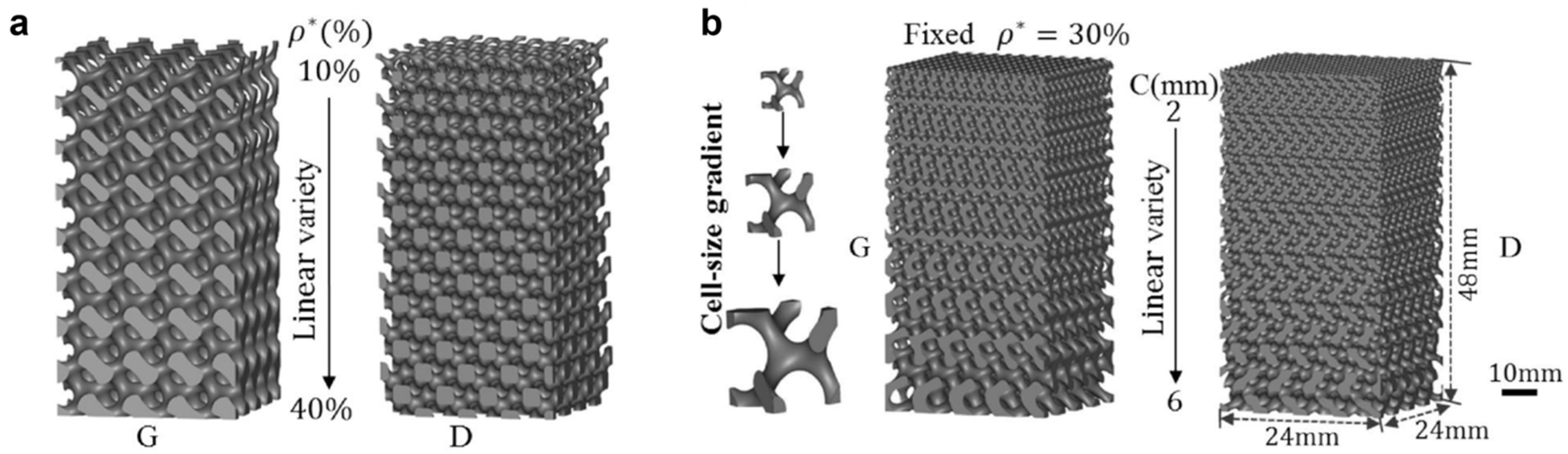 - Vijayavenkataraman, S.; Kuan, L.Y.; Lu, W.F. 3D-printed ceramic triply periodic minimal surface structures for design of functionally graded bone implants. Mater. Des. 2020, 191, 108602. [Google Scholar] [CrossRef]