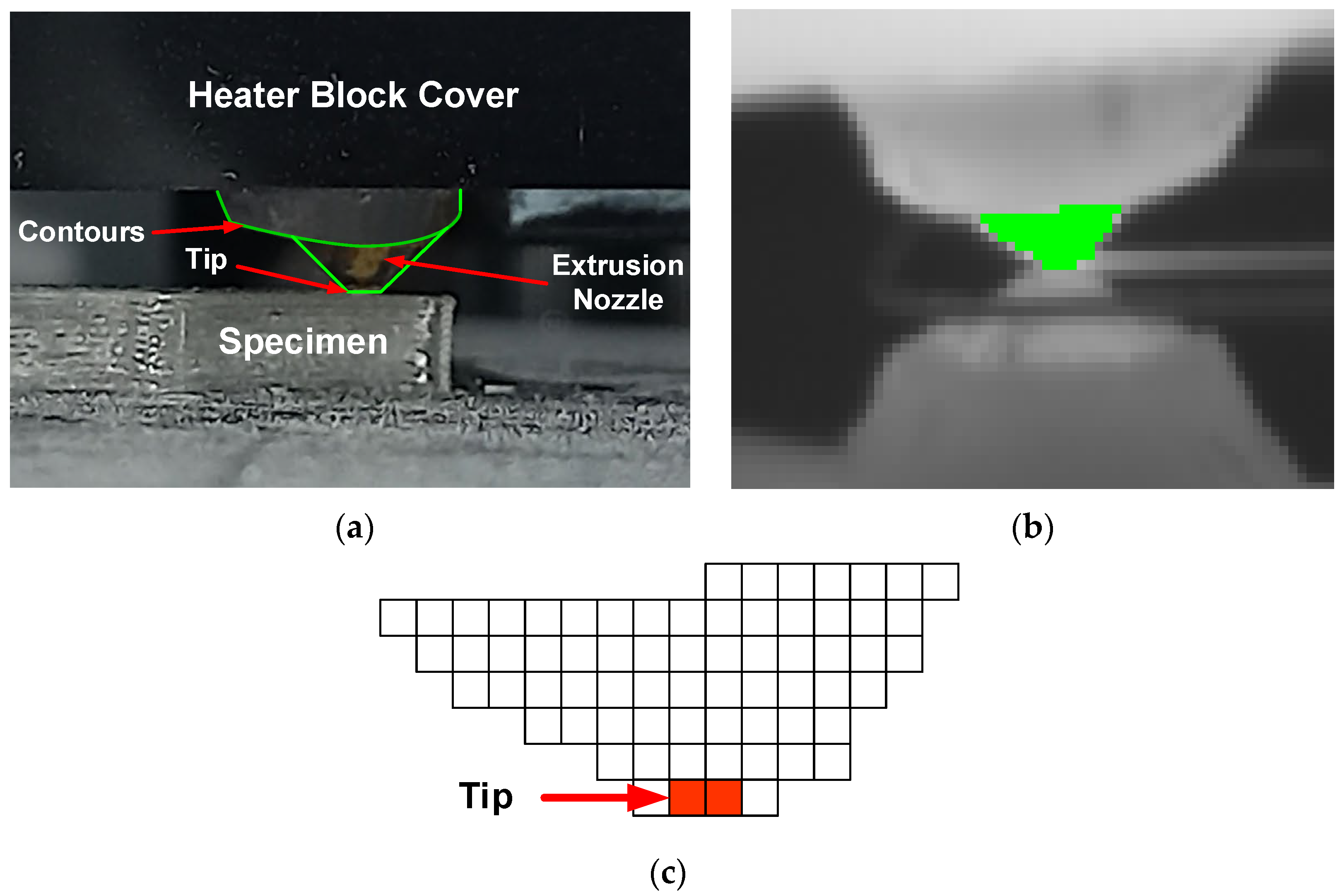 - Li, F.; Yu, Z.; Li, H.; Yang, Z.; Kong, Q.; Tang, J. Real-Time Monitoring of Raster Temperature Distribution and Width Anomalies in Fused Filament Fabrication Process. Adv. Manuf. 2022, 10, 571–582. [Google Scholar] [CrossRef]