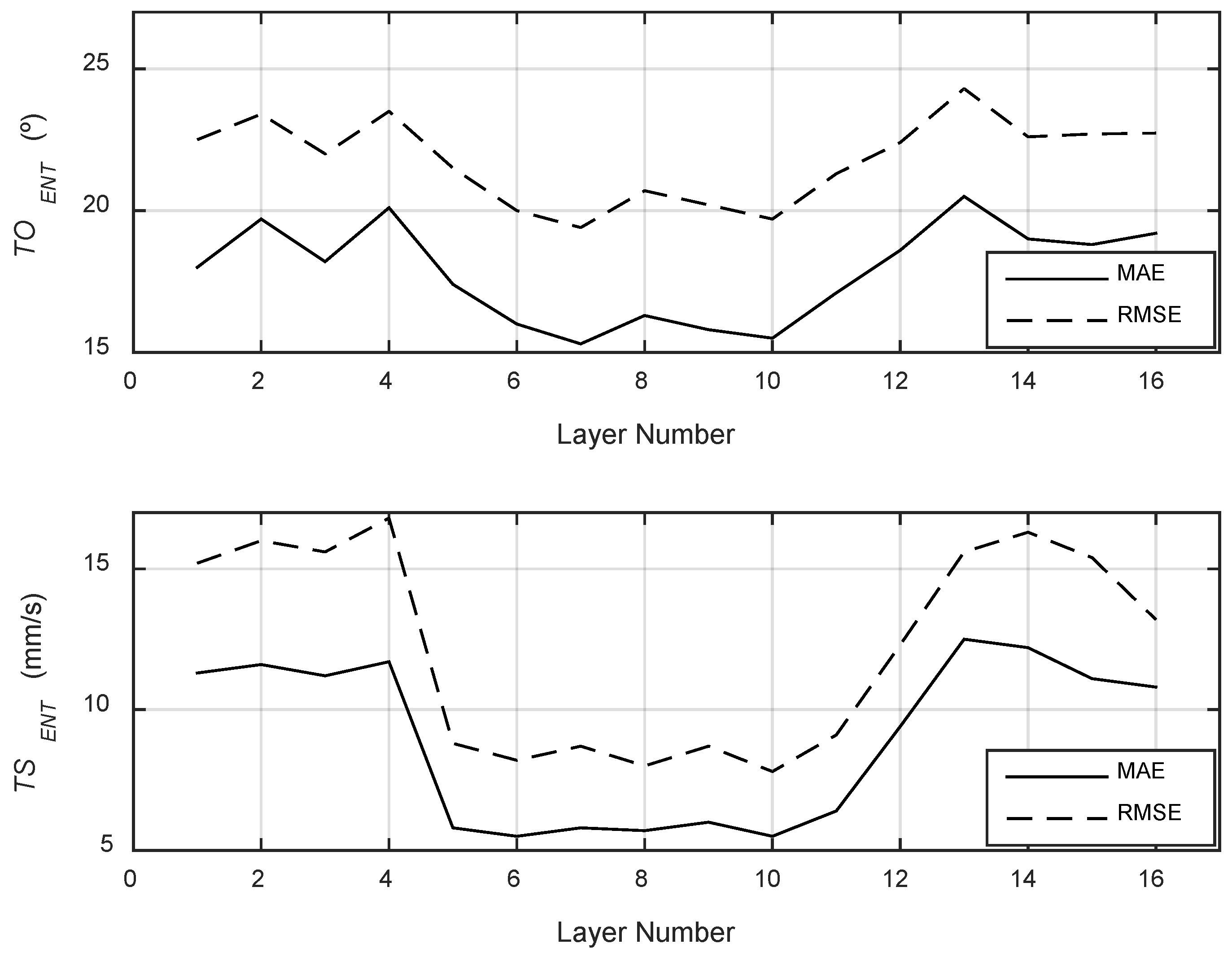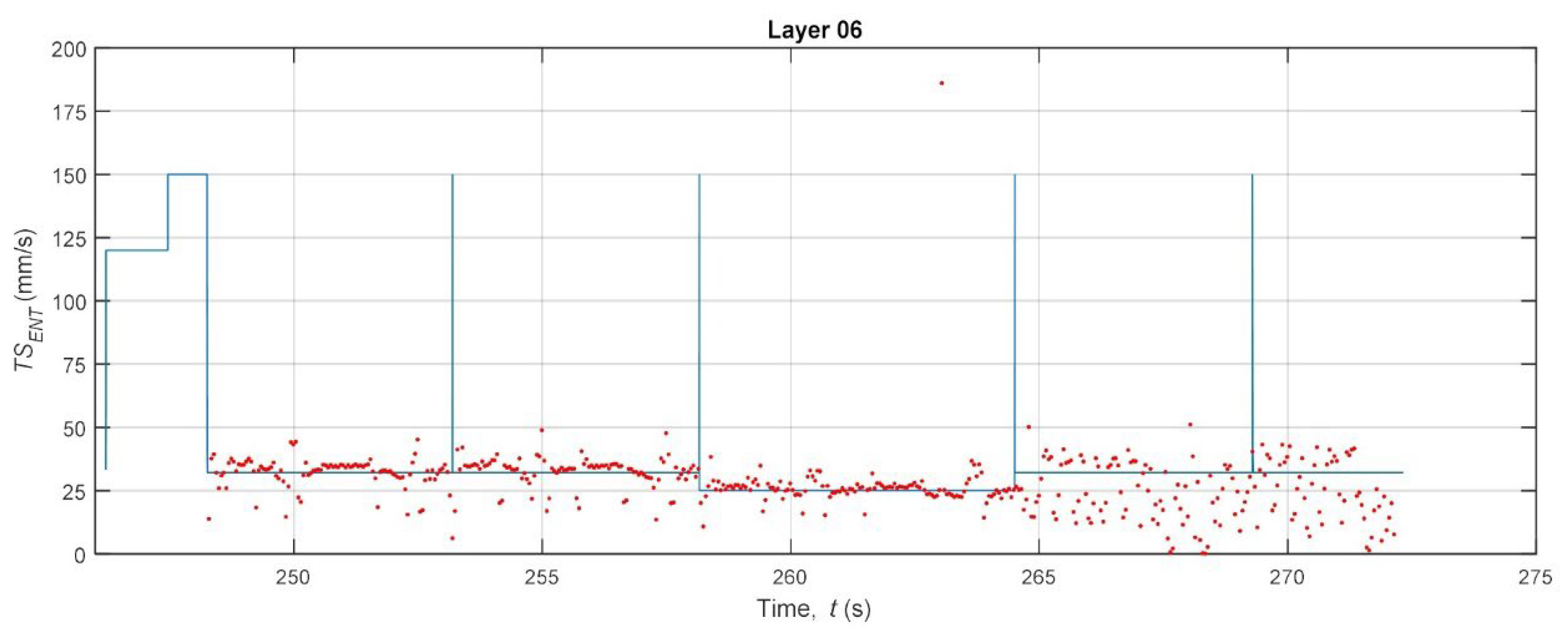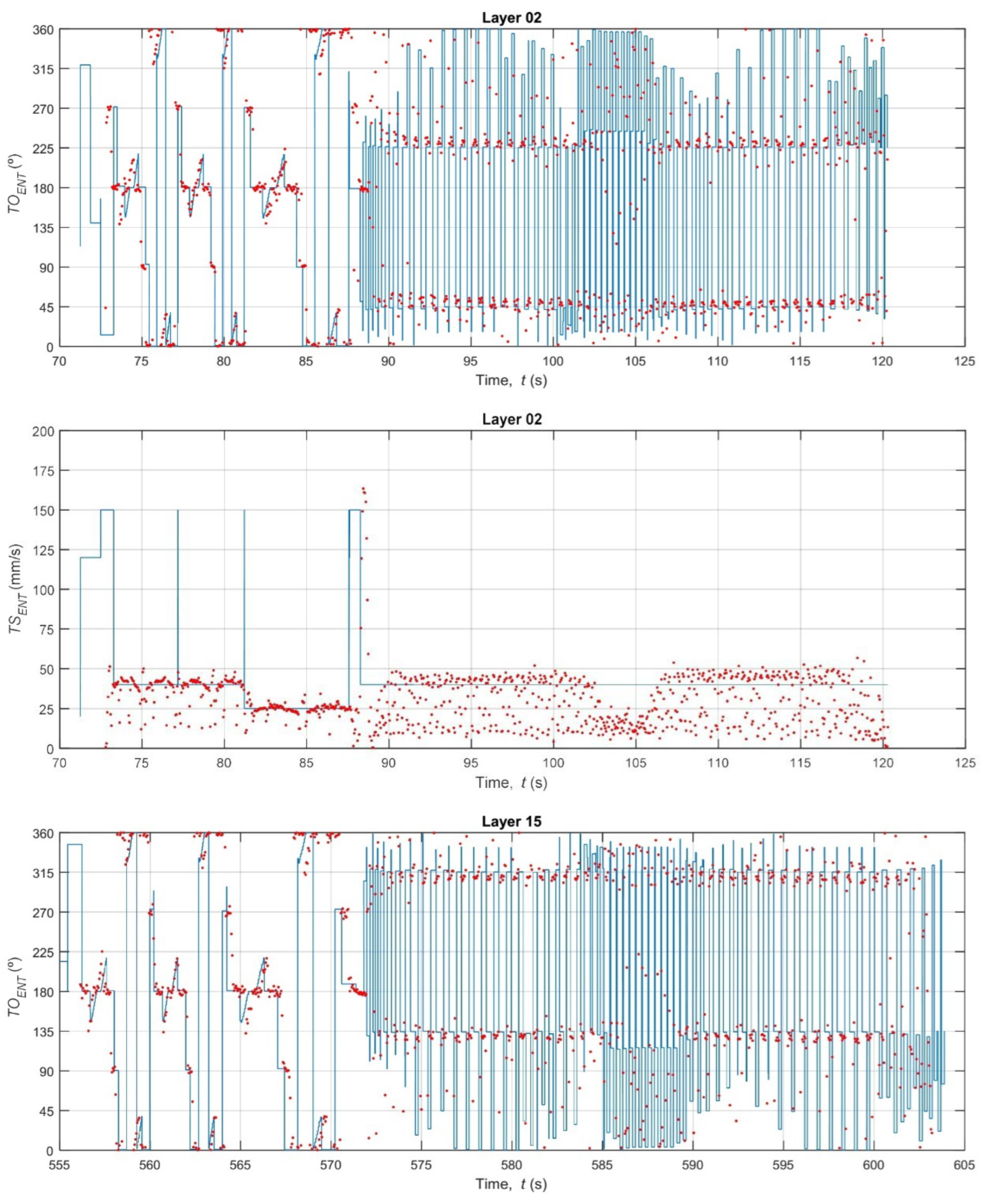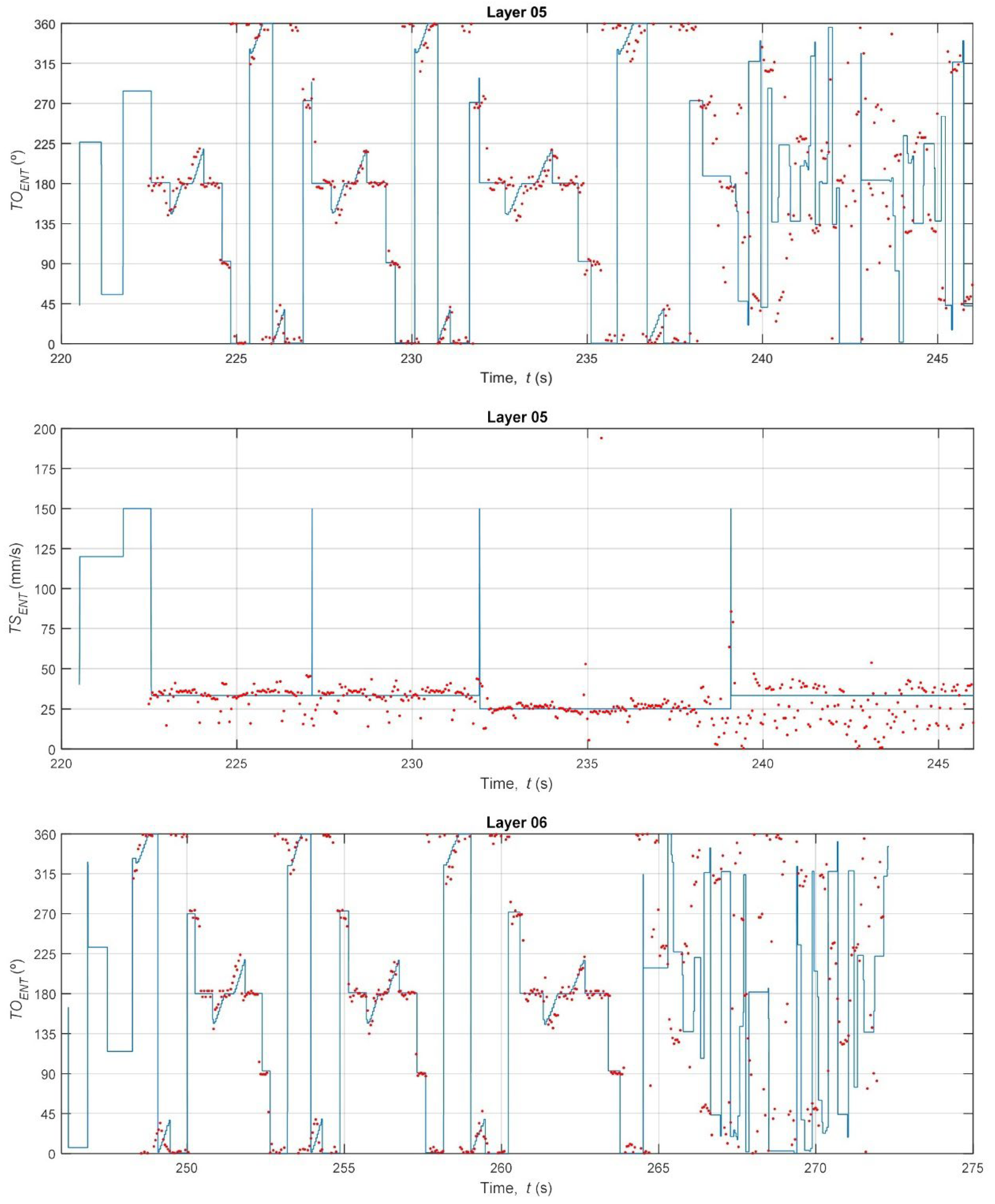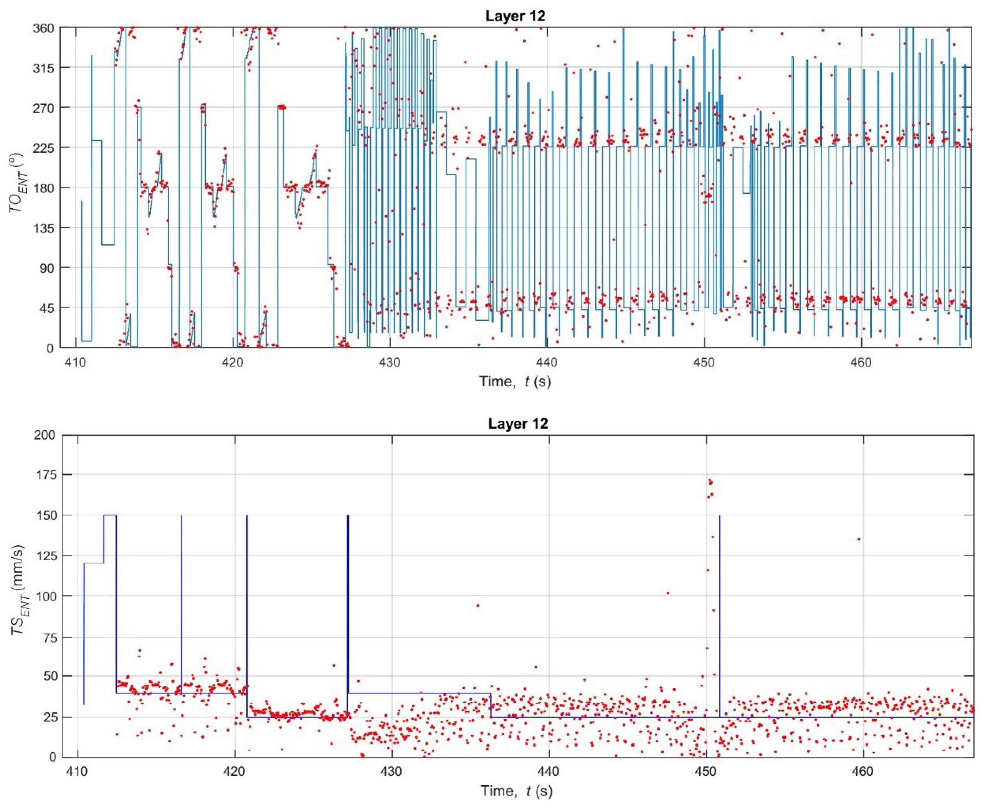 - The orientation error (TOENT) was consistently high across all layers (MAE ≈ 15.3–20.5°). This finding is not a measurement failure but rather the first-time quantification of the physical lag, jerk, and stabilization time the extruder head experiences during rapid directional changes—dynamics that are idealized and ignored by the nominal G-code. This metric serves as a direct measurement of the printer’s mechanical limitations.