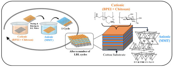 Schematic diagram of the BPEI/CH and MMT layering through the LbL method.