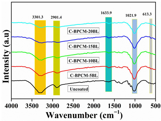 FTIR spectroscopy is an analytical technique employed to characterize organic, polymer-based, and certain inorganic materials by examining chemical bonds and molecular structure. It provides critical information about the molecular structure by detecting vibrations of specific chemical bonds. When a sample is exposed to infrared radiation, a distinct functional group absorbs energy at characteristic wavenumbers, resulting in unique peaks. The FTIR spectra of untreated and treated cotton fabric specimens are illustrated in Figure 2. The broad absorbance band in specimens at 3301 cm−1 and 2901 cm−1 is assigned to the stretching -OH and C-H vibration bonds, respectively [30]. However, both peaks are characteristic of cellulose, and the diminished intensity of these peaks is due to the cellulose backbone layering of cotton fibers, which suggests effective shielding of cellulose functional groups due to the deposition of coating species. Absorption band observed at 1633.9 cm−1 in the coated samples ascribed to the C=O vibration of the acetyl group (in the amide I region) of chitosan [31], confirming the biopolymer on the fiber surface. The band at 1021.8 cm−1 in the untreated cotton is attributed to the CO and OH stretching vibrations of the polysaccharide in cellulose [32]. However, in the coated samples, the peak sharpness and intensity increased, which is assigned to the Al-O-Al group because of the MMT clay [33,34]. A small new absorbance peak at 613.3 cm−1 is due to Si-O-Al bending vibration [35,36]. However collective spectral changes in FTIR spectra provide strong evidence that an organic–inorganic hybrid layer was effectively deposited onto the cotton fibers.