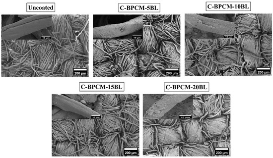 SEM is commonly used to examine the surface structure of solid materials in great detail. It produces detailed images of a sample by scanning it with a focused beam of electrons, which interact with the surface to provide a high-resolution morphological information [37]. Subsequently, the morphological features and surface element distributions of each sample were observed using SEM coupled with EDX and illustrated in Figure 3. As shown in Figure 3, the SEM images of the uncoated specimen show a plain-weave structure characterized by a surface that appears to be relatively smooth. However, the roughness of the surface is observed to be increased with the number of coating layers due to natural growth as reported [38]. Additionally, the gap between the fibers gradually diminished and merged as the number of deposited layers increased. Small MMT aggregates appear between the fabric fibers, possibly caused due to insufficient rinsing during the layer deposition process Figure 3, while this kind of surplus coating is often seen on the substrate with wavy surfaces, including fibers, fabrics and foams [39,40,41]. Additionally, the cotton fabric surface gradually appears more densely coated with increasing coating layers, as fewer individual fibers remain exposed within the yarn structure. However, even after 20 layers, some protruding microfibers and localized agglomerated regions are still observable in the inter yarn spaces.