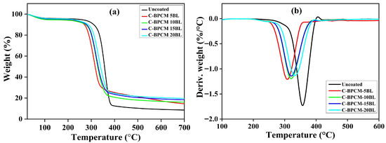 The thermogravimetric analysis was performed to examine the degradation behavior of uncoated and coated samples, as illustrated in Figure 5a,b. Both untreated and treated samples exhibited a single-step degradation process. An initial weight loss below 130 °C was observed, which can be attributed to the vaporization of water and other physically attached substances on the fibers [42,43]. Subsequently, in uncoated fabric, the dominant thermal degradation event was observed in the region of 310–390 °C, with maximum weight loss recorded at 360 °C. Approximately 59.9% mass reduction was detected as shown in Figure 5b, where the high evaluation of combustible gases, abrupt ignition, and the spontaneous ignition threshold (~400 °C), which accumulated thermal energy, drive auto-combustion as reported in earlier studies [44,45,46]. Interestingly, the coated samples start early degradation, and Tonset temperature decreases to lower values as tabulated in Table 2. However, the coated samples exhibited slightly reduced thermal stability, as indicated by their thermal degradation curves shifting to the left compared. This early thermal degradation in flame-retarded samples facilitates the timely formation of a protective char layer, which might delay ignition [47,48]. This behavior was mainly caused by the decomposition of chitosan and branched polyethyleneimine (BPEI), which starts decomposition at approximately 247 °C and 300 °C, respectively, as reported in the literature [39,49,50]. Such premature behavior in modified samples dilutes the effect of combustible gases by release of nonflammable gases and expedites char formation, which functions as an insulating barrier and prolongs the ignition time [47]. Despite the earlier onset, the coated layers resisted mass loss at higher temperatures, resulting in a significantly higher char residue compared to the uncoated specimen. The highest char residue is found to be for the maximum 20-layer coated sample with 19.67% magnitude at 700 °C.