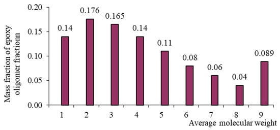 with its help, it became possible to link the molecular weight distribution and fractional composition. In Equation (8), is the polymerization degree, and is the degree of completion of the polycondensation reaction. Table 2 presents the fractional composition, the number of fractions contained in them, and their average molecular weights , as well as the average weight average molecular weight of the studied oligomers calculated in [122].