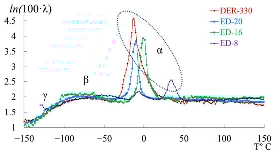 Taking into account these features and the analysis of the literature sources, when considering relaxation processes in epoxy oligomers in detail, we divided them into and processes, mainly based on the temperature values of the transition maxima: for the transition—below −100 °C, and for the transition—from −100 °C to the relaxation.