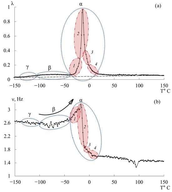 - a low-temperature β-transition, the nature of which is still debatable for various polymers; however, according to most authors, the β-transition is caused by a smaller scale and cooperative movement (compared with the α–transition) of relatively small sections of the polymer chain [26,76,77,78]—for example, links or segments [74,79];