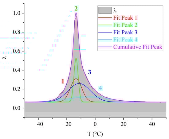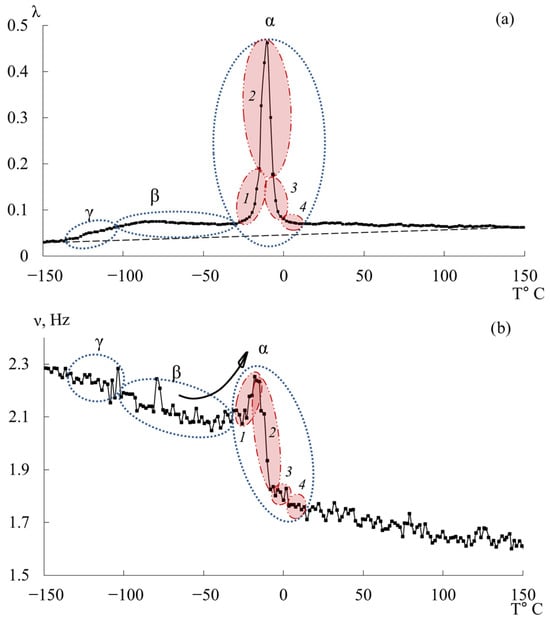 This is because the elements of these subsystems—links, segments, amorphous, or crystalline phases [15,19,24,42,43,44]—possess their own structure. The transition of these elements from a thermodynamic and mechanical nonequilibrium state to equilibrium is determined by their transition functions, which are among the main factors causing temperature- and frequency-localized dissipative processes. These manifest on internal friction spectra as loss peaks of various intensities positioned at distinct temperature intervals [19,42,43,45,46,47,48,49,50,51,52,53]. The ensemble of these transitions has a decisive impact on the service performance of polymer products under diverse operating conditions. The dynamic characteristics of these transitions are evaluated via their transition functions, which describe the system’s response both to internal changes and to external perturbations. From variations in these parameters, valuable information about the internal structure of the studied systems can be inferred.
