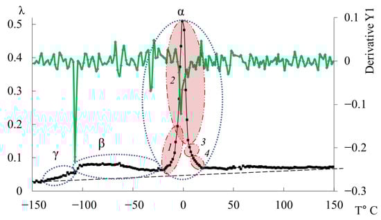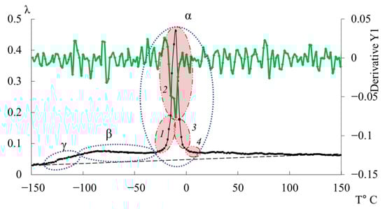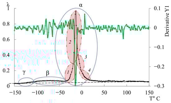 In addition to the “basic” , , and transitions, some authors identify “additional” relaxation processes for polymer systems, designated by them as , , , and others, as well as the transition [113]. The transition observed during in many flexible polymers, at temperatures above the temperature of the process, occupies a special place. According to [113], it is responsible for the transformation of a “liquid with a fixed structure” into a true liquid state and may be due to the presence of macromolecule associates, which in turn are nucleus of crystallization for polymers. Note that from this point of view, the transition is unlikely for epoxy meshes due to a sufficiently high cross-link density and lack of tendency to crystallization; however, it is possible for the initial diane oligomers [114].