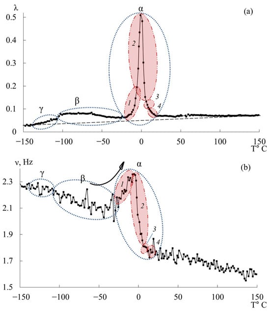 Under an external deforming action, the response of the investigated system depends on the total reaction of its structural–kinetic subsystems, which act quasi-independently within their own temperature–frequency ranges [40,41]. The reaction of each structural-kinetic subsystem manifests itself in its own temperature-frequency range, is quasi-independent of the reaction of other structural-kinetic subsystems and is determined by its physicomechanical and physicochemical characteristics.