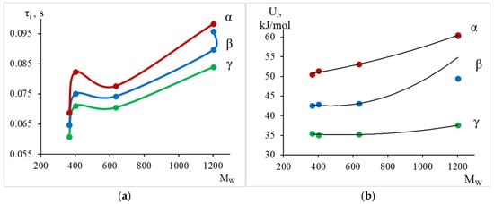 The existence of a broad spectrum of local relaxation times arises even in the simplest macromolecules, such as polyethylene [19,20,21,22,23,24,25], polyethylene oxide [26,27,28,29,30,31,32,33,34,35,36], and polyvinyl alcohol [37,38,39], where multiple relaxators can be distinguished. Vibrational–rotational motions of atoms, side groups, and crankshaft-type rotations of intra-chain atomic groups are all characterized by different relaxation times. An increase in molecular structural complexity naturally leads to changes in relaxation spectra and temperature–frequency dependences.