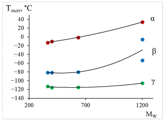 - the low-temperature γ-transition is associated with the smallest-scale processes among the listed transitions and, according to many authors, is caused by the movement of the smallest sections of the polymer chain (side group [76], aliphatic groups –CH2– in the main chain [80], etc.). It is observed at fairly low temperatures (below −100 °C) and rarely falls within the temperature range of studies. In addition, not all methods make it possible to visualize the γ-relaxation process (for example, by high-frequency experiments [81]). In dielectric spectra, γ-transitions are often not resolved and merge into a single blurred maxim [76].
